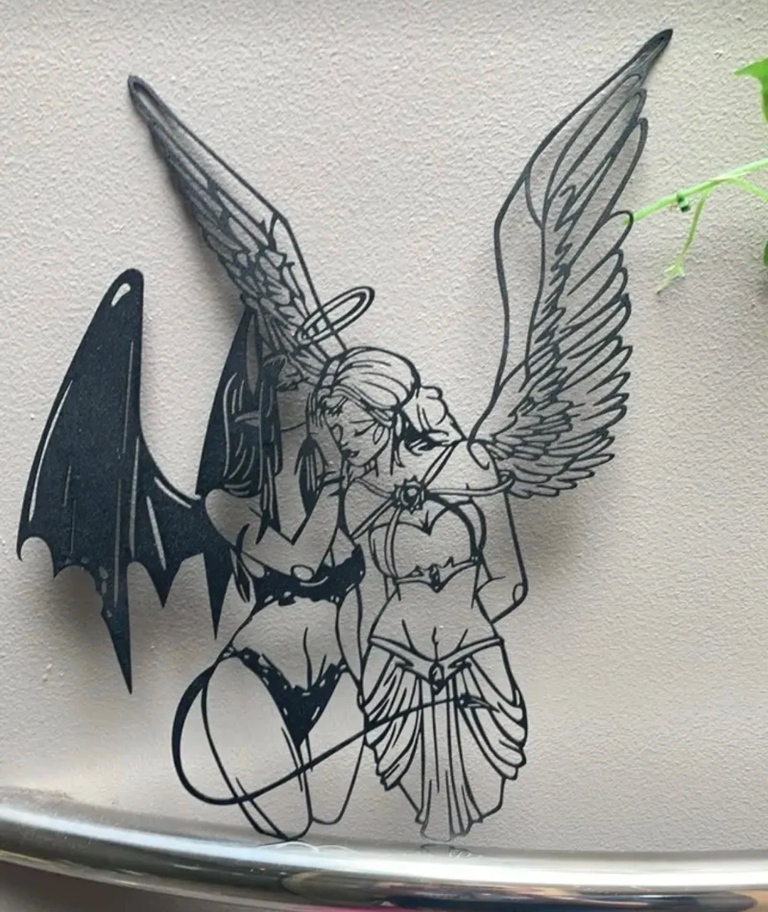 This metal wall art features a striking depiction of an angel and a demon. It's approximately 11.81 inches tall and 10.23 inches wide. This unique piece would add a touch of gothic or fantasy art to any room!