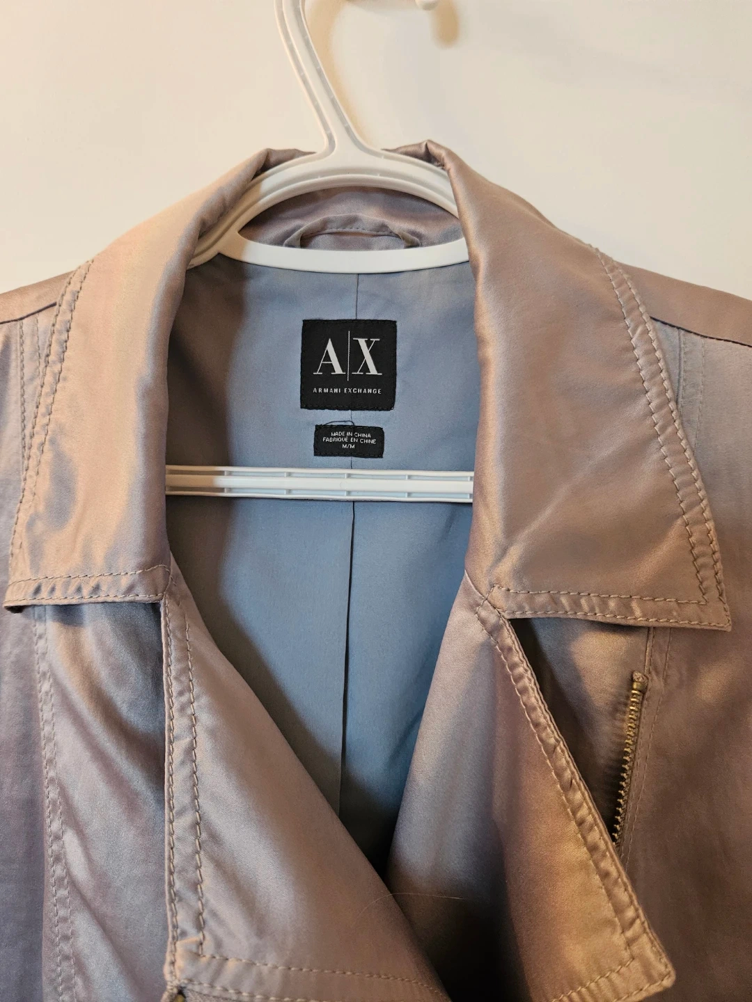 This AX Armani Exchange jacket is a stylish addition to any wardrobe. It's a size medium with a shimmering taupe exterior and a blue lining. Features zippered pockets and an asymmetrical zip closure.