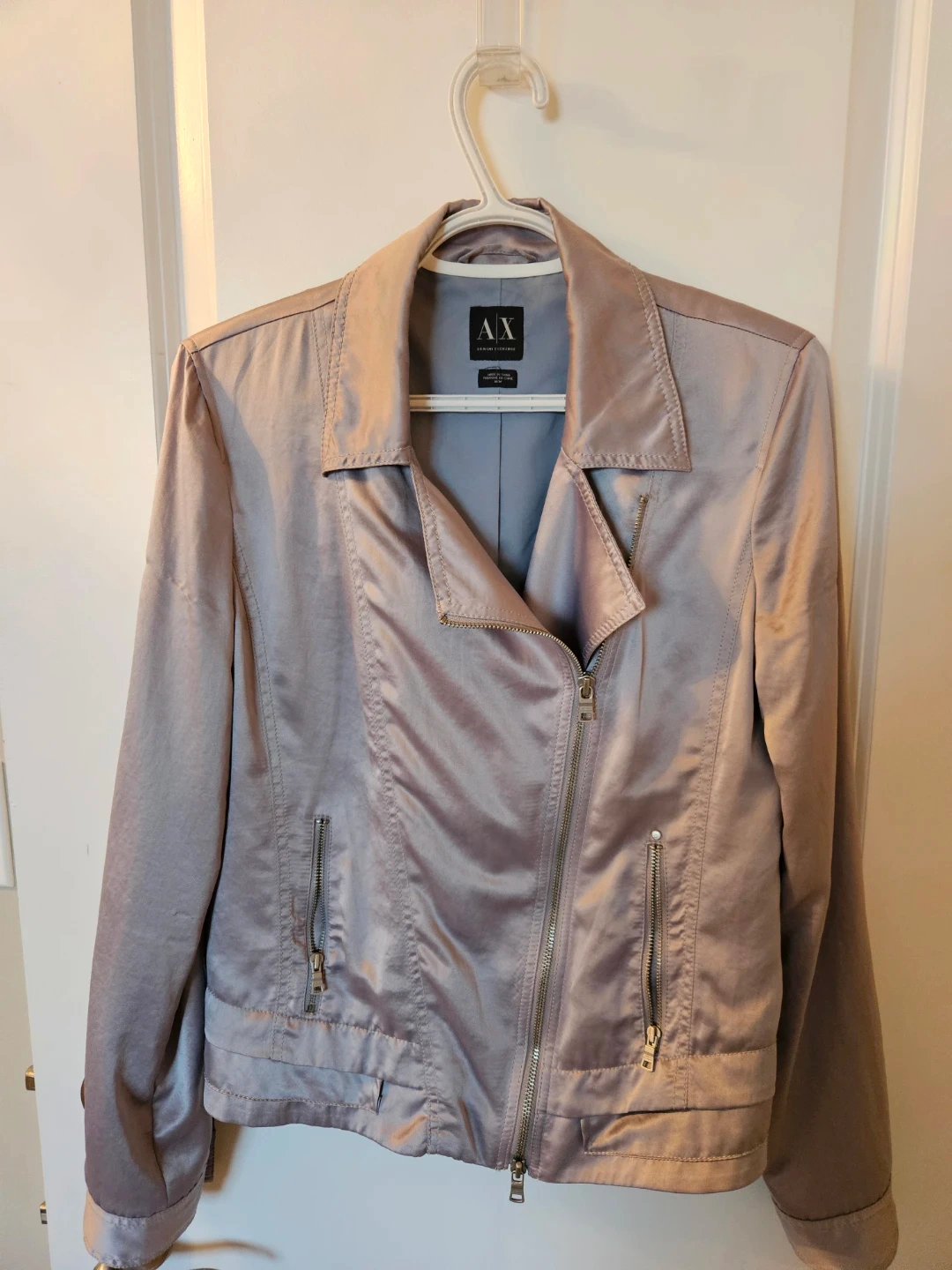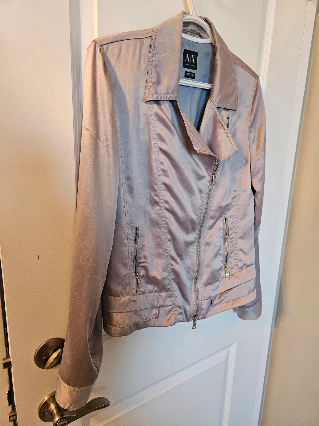 This AX Armani Exchange jacket is a stylish addition to any wardrobe. It's a size medium with a shimmering taupe exterior and a blue lining. Features zippered pockets and an asymmetrical zip closure.