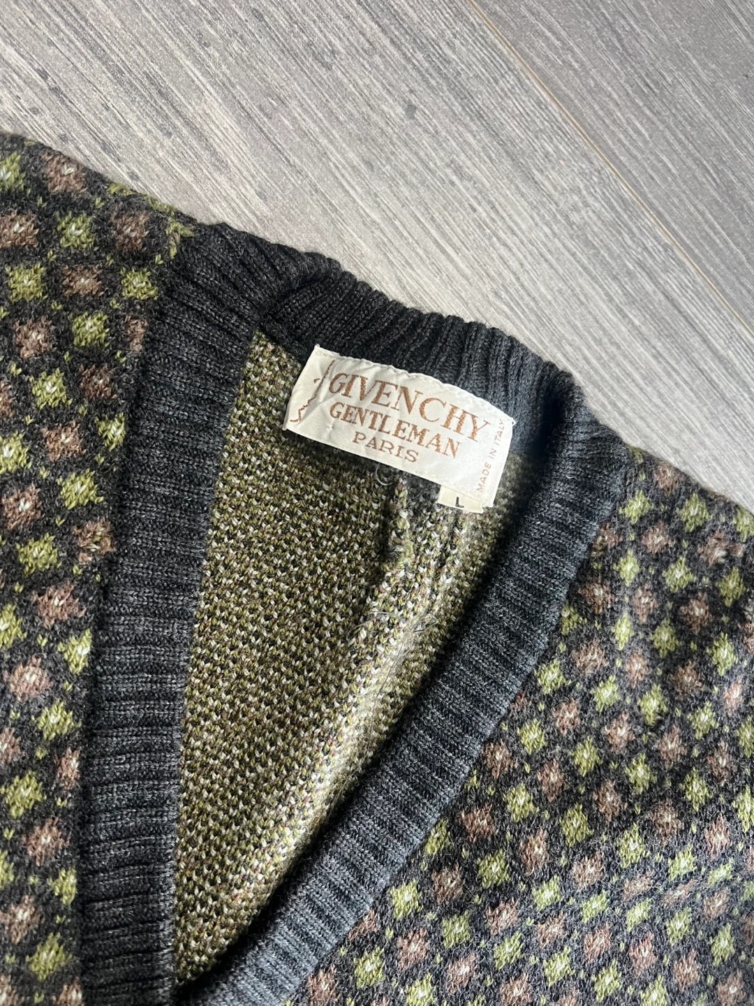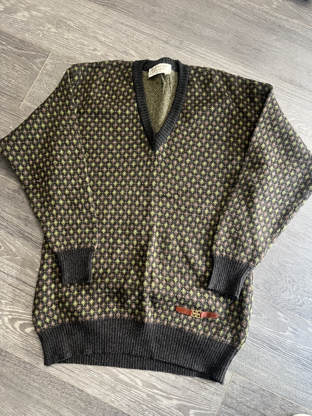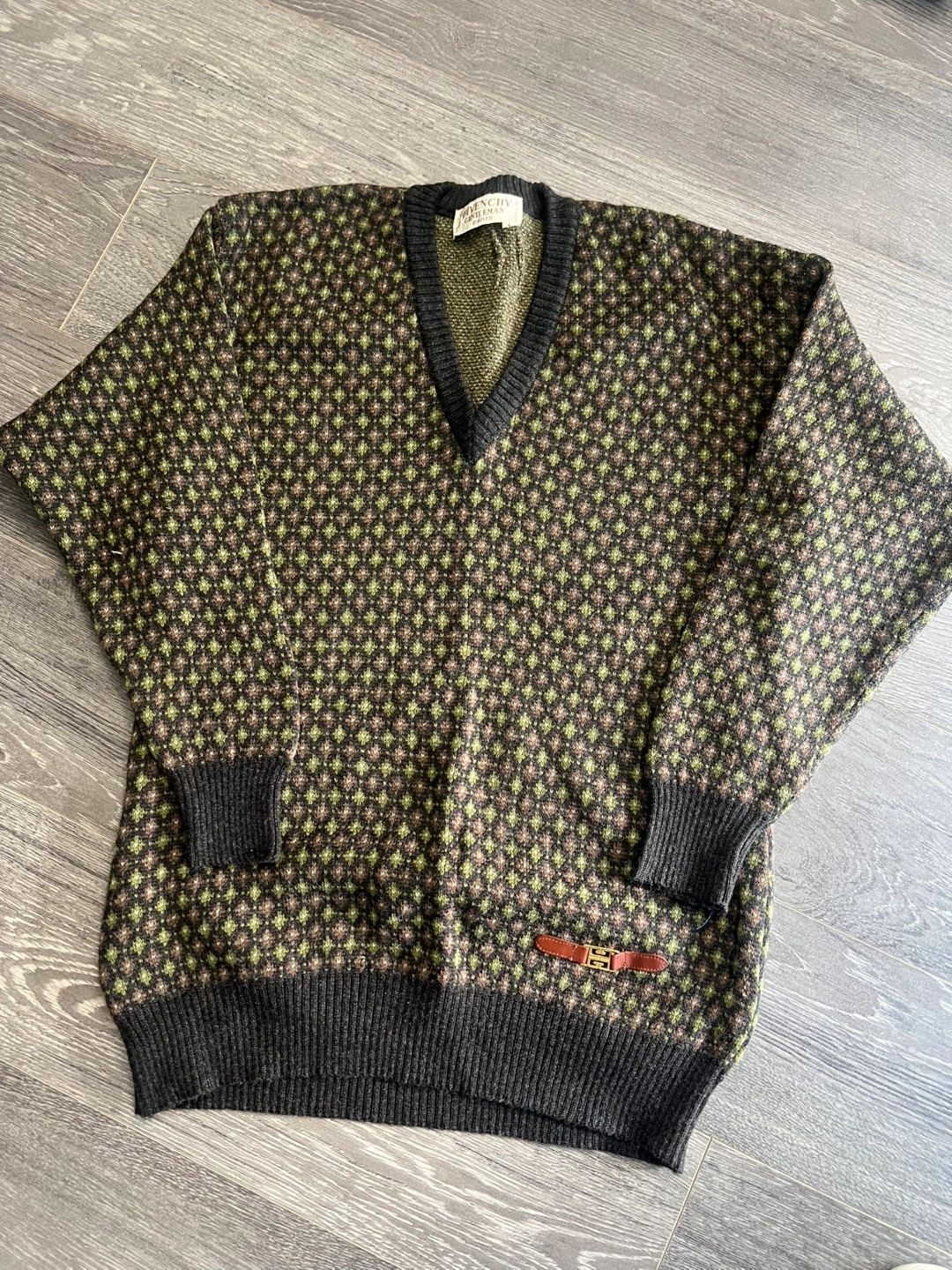 A vintage Givenchy Gentleman Paris v-neck sweater made from 100% wool. It's a size large and features a unique geometric pattern. Made in Italy.
