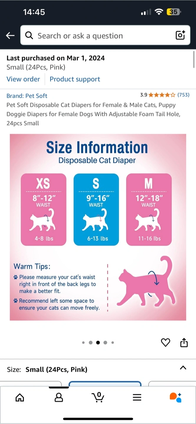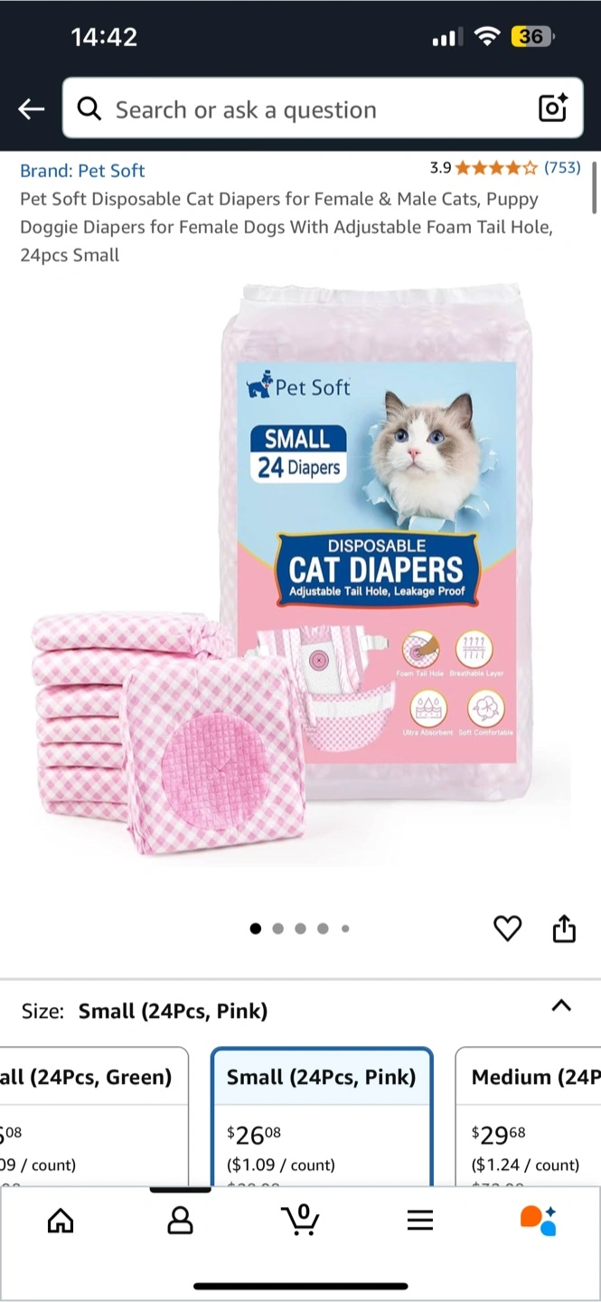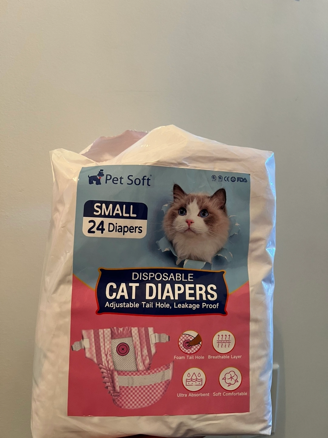 Keep your furry friend comfy with these Pet Soft disposable cat diapers! They're size small and come with 17/24 diapers in the pack. The diapers feature an adjustable tail hole and are designed to be leakage-proof, so you can rest easy. They're also ultra-absorbent and soft, ensuring your cat stays comfortable.