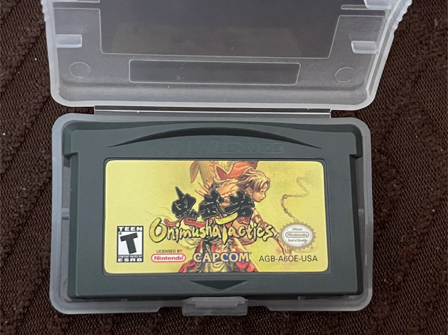 This is a Nintendo Game Boy Micro, Happy Mario 20th Anniversary edition in red and gold. It's a compact handheld gaming device. It includes the 'Onimusha Tactics' game cartridge and accessories and charger.