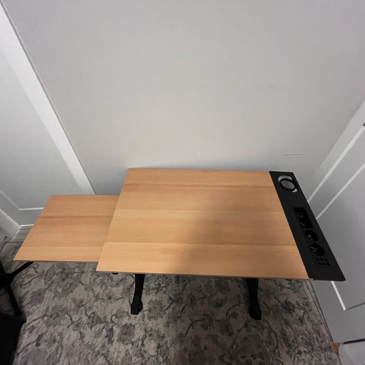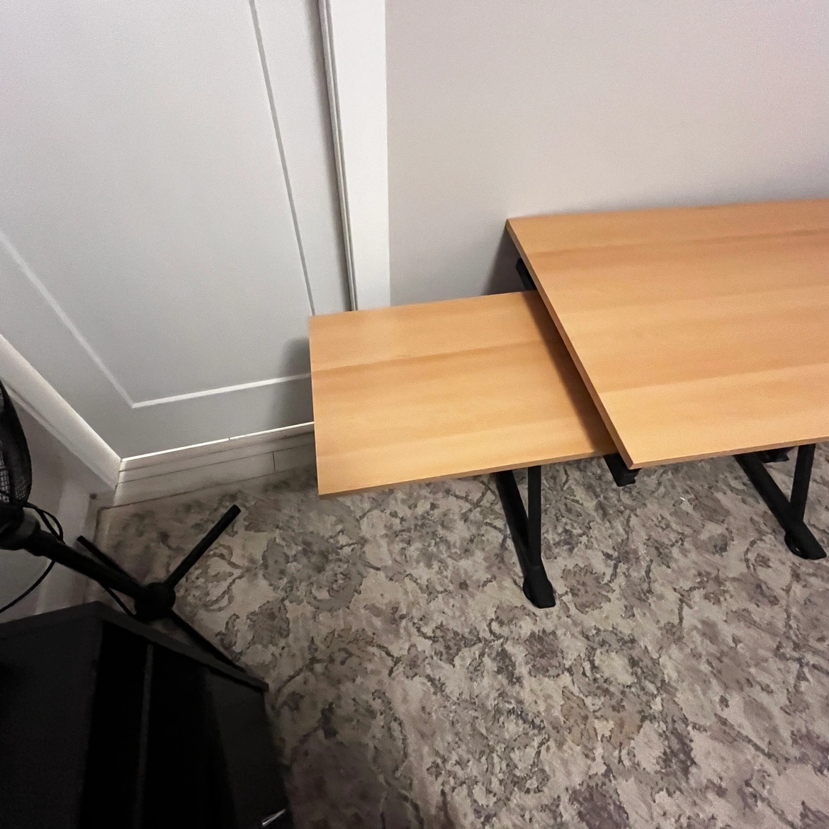 Black metal frame with a wood top that can be adjusted to standing height. It includes a small shelf for storage. It is in good condition with minor wear and tear. Chat for the accurate address