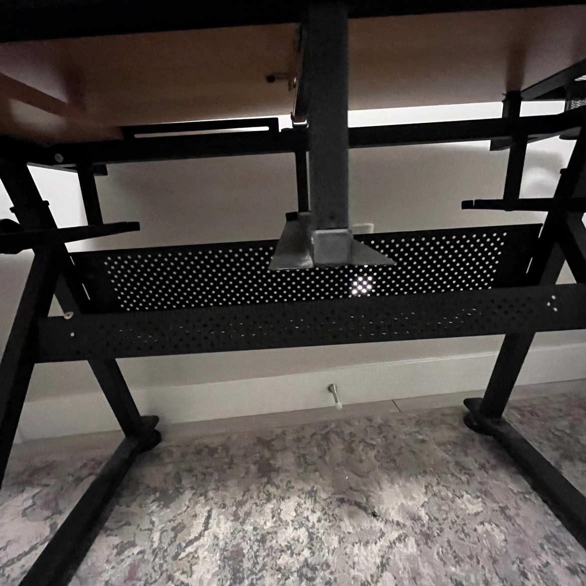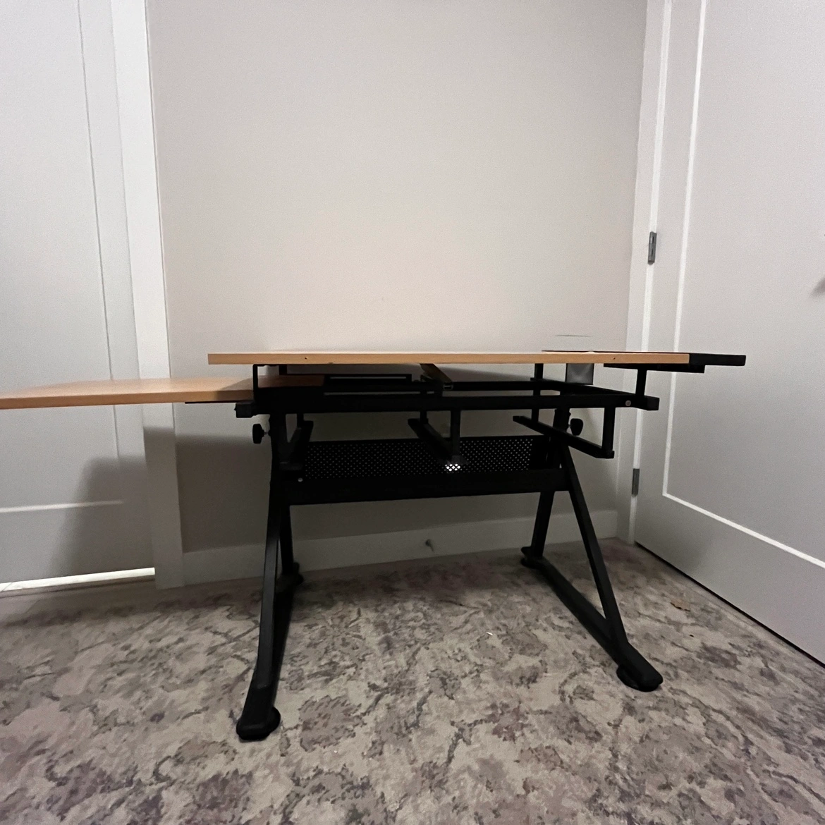 Black metal frame with a wood top that can be adjusted to standing height. It includes a small shelf for storage. It is in good condition with minor wear and tear. Chat for the accurate address
