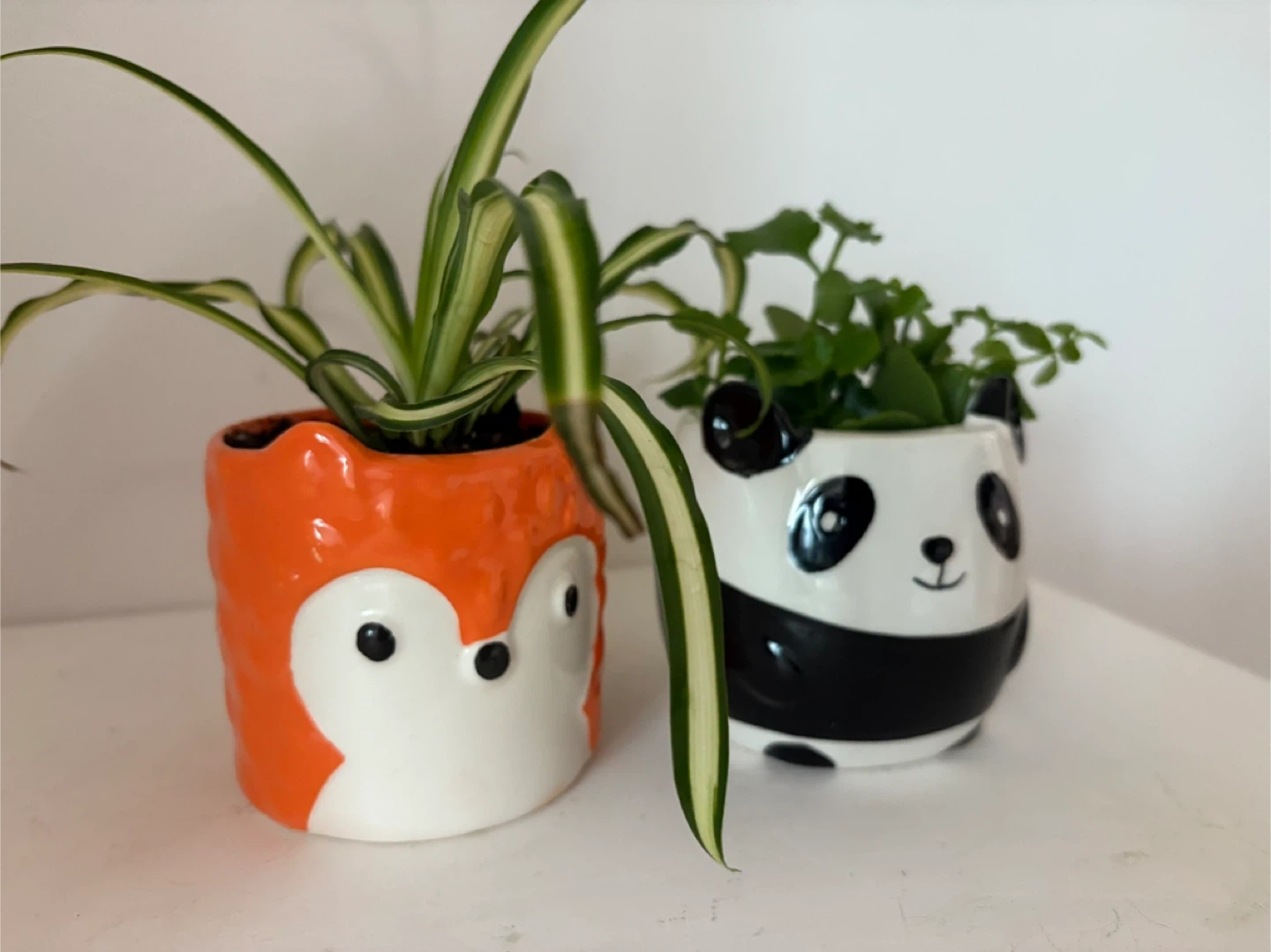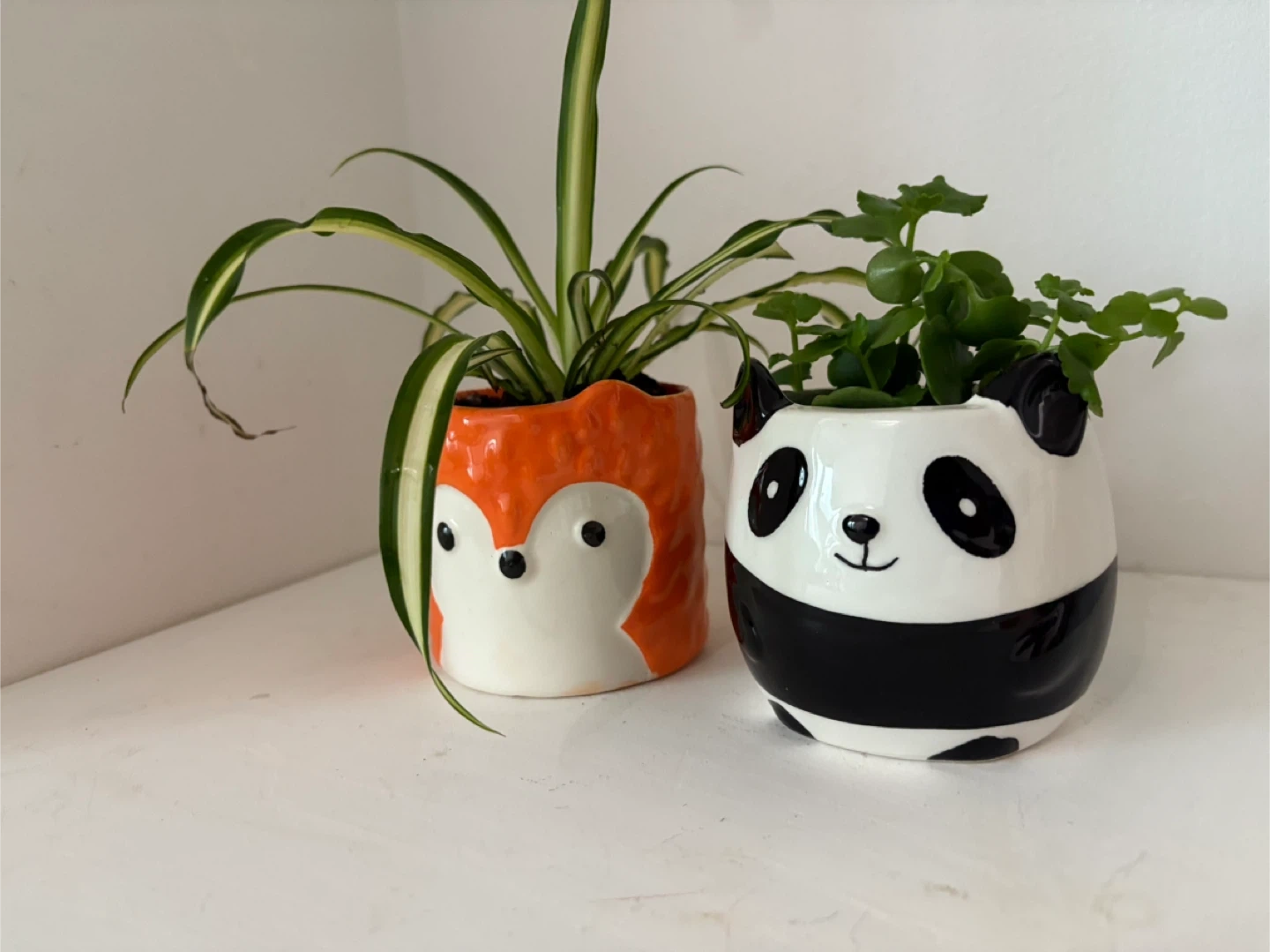 Two ceramic planters, one shaped like a fox and the other a panda. Includes a spider plant in the fox planter and a succulent in the panda planter. These decorative pots would add a fun touch to any space!