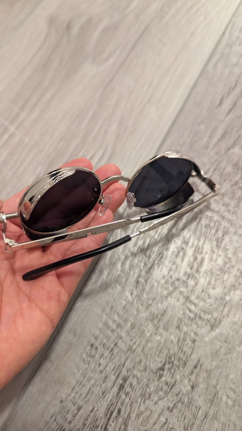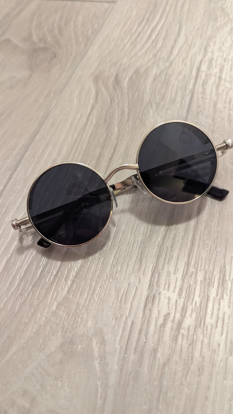 These round sunglasses feature a silver-toned metal frame with dark tinted lenses. The arms have a subtle decorative etched design. They're perfect for adding a touch of retro style to any outfit.