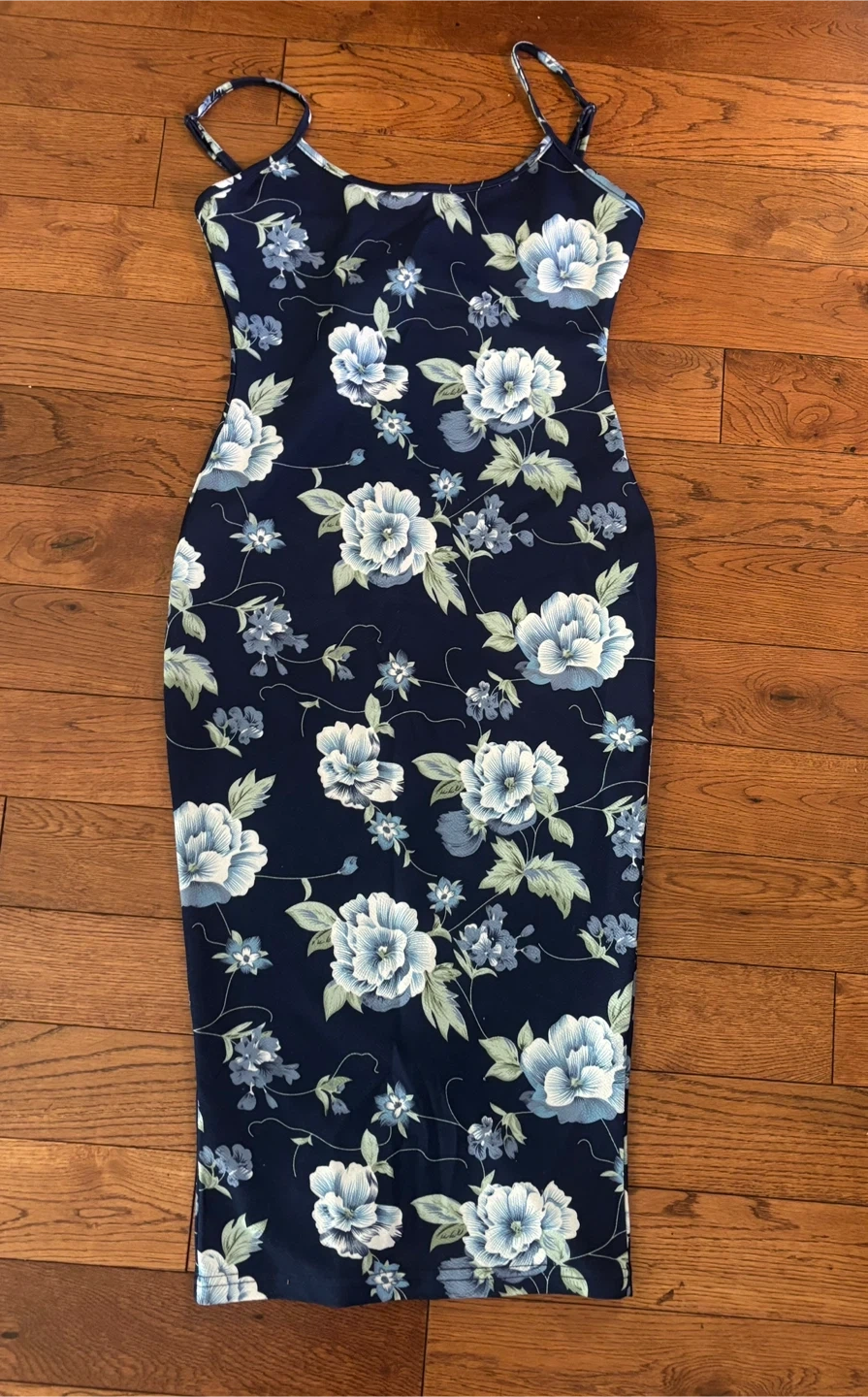 This navy blue midi dress features a charming floral print with light blue and white flowers. It has thin spaghetti straps and a modest slit at the hem. The fabric is stretchy and lightweight, perfect for warmer weather. Size small