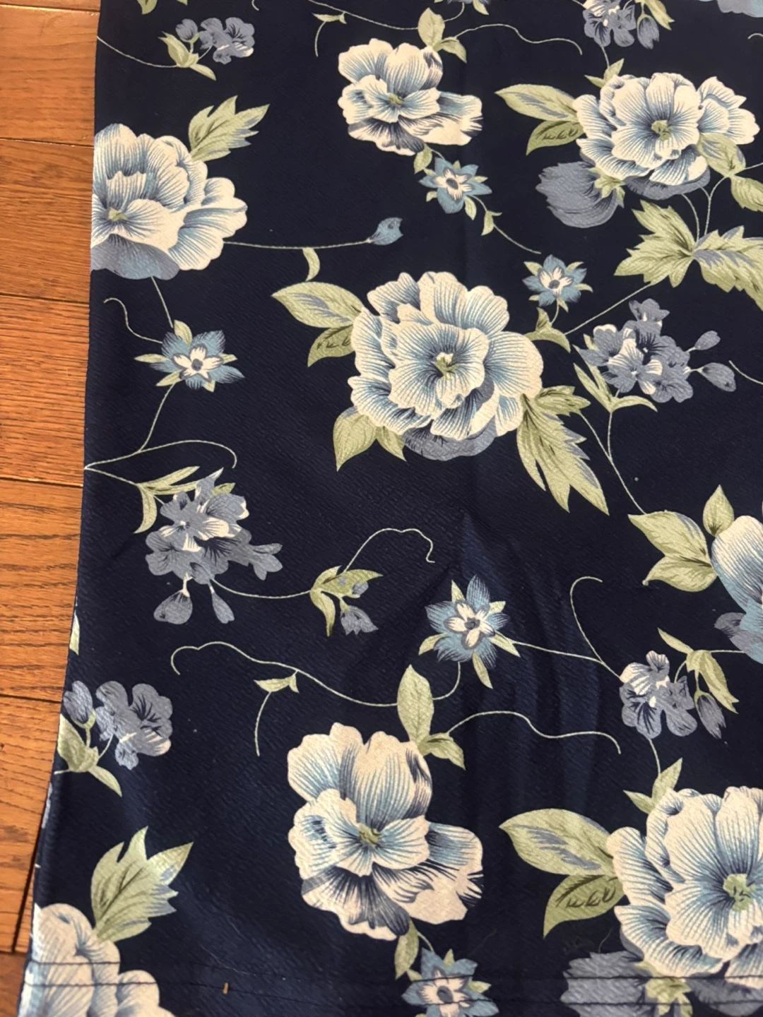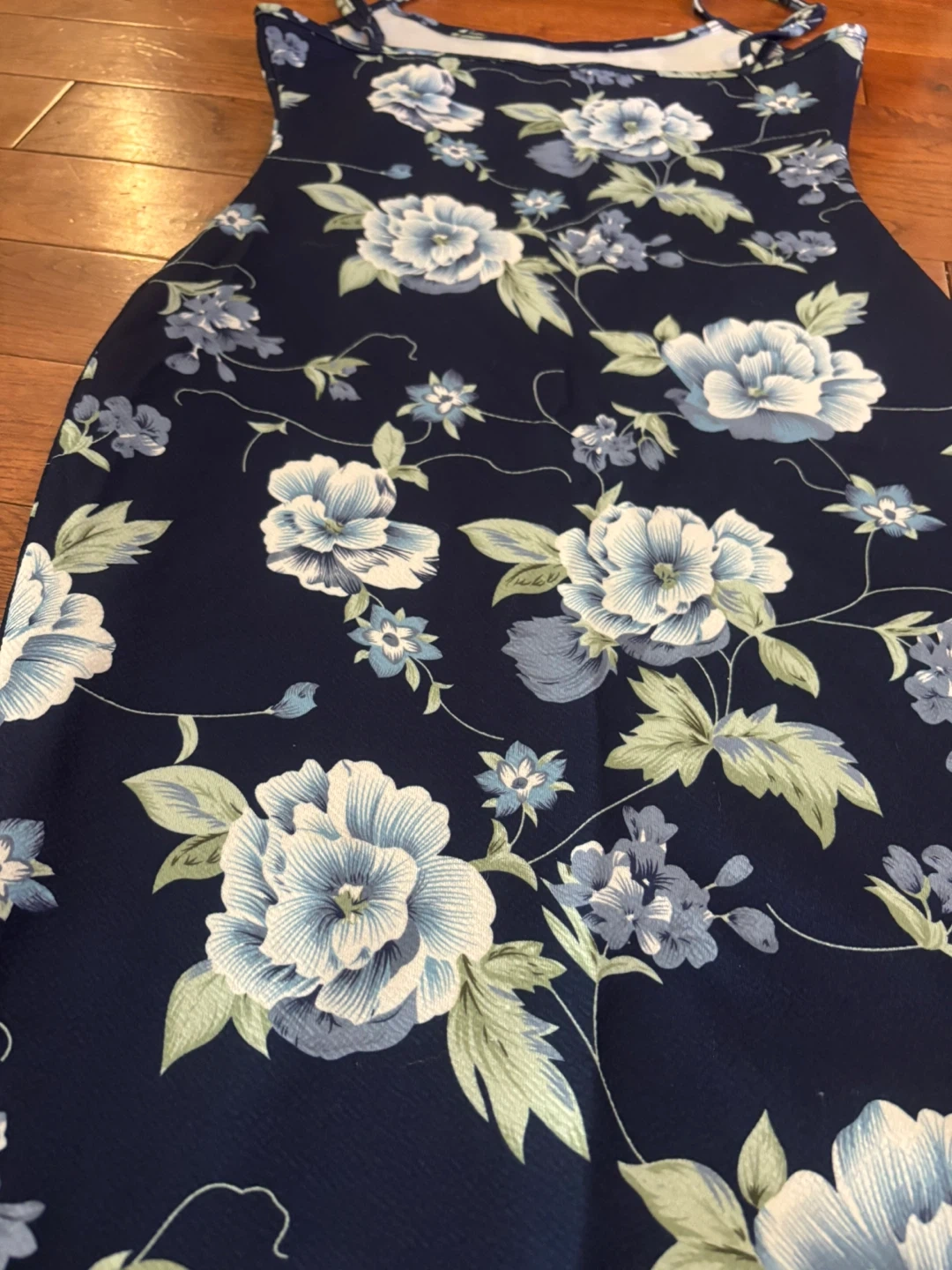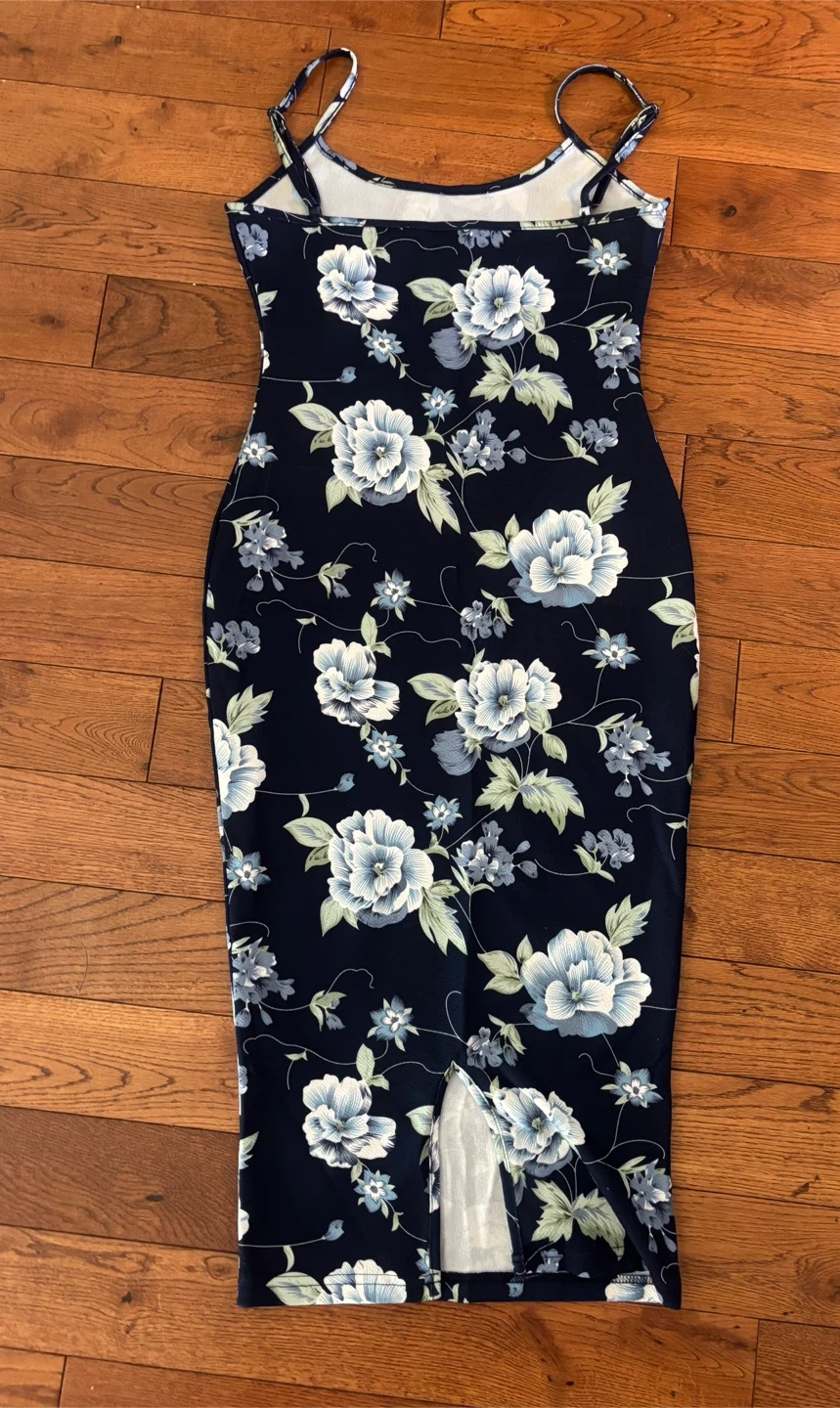 This navy blue midi dress features a charming floral print with light blue and white flowers. It has thin spaghetti straps and a modest slit at the hem. The fabric is stretchy and lightweight, perfect for warmer weather. Size small