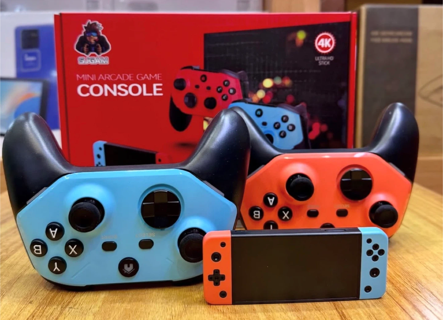 This is a mini arcade game console. It supports 4K Ultra HD output. The console comes with two controllers, one in blue and one in red. "Retro Game Stick" that typically comes pre-loaded with a massive library of anywhere from 20,000 to over 30,000 Examples main games: • PSP & PS1: God of War: Chains of Olympus, Tekken 6, Spider-Man, WWE SmackDown vs. Raw, Grand Theft Auto (GTA) Vice City Stories, and Crash Bandicoot. • Arcade & Fighting: Street Fighter II, The King of Fighters series, Metal Slug, and Mortal Kombat. • Nintendo Classics (NES/SNES/N64): Super Mario Bros., The Legend of Zelda, Mario Kart 64, and Donkey Kong Country. • Sega Classics: Sonic the Hedgehog, Golden Axe, and Streets of Rage.