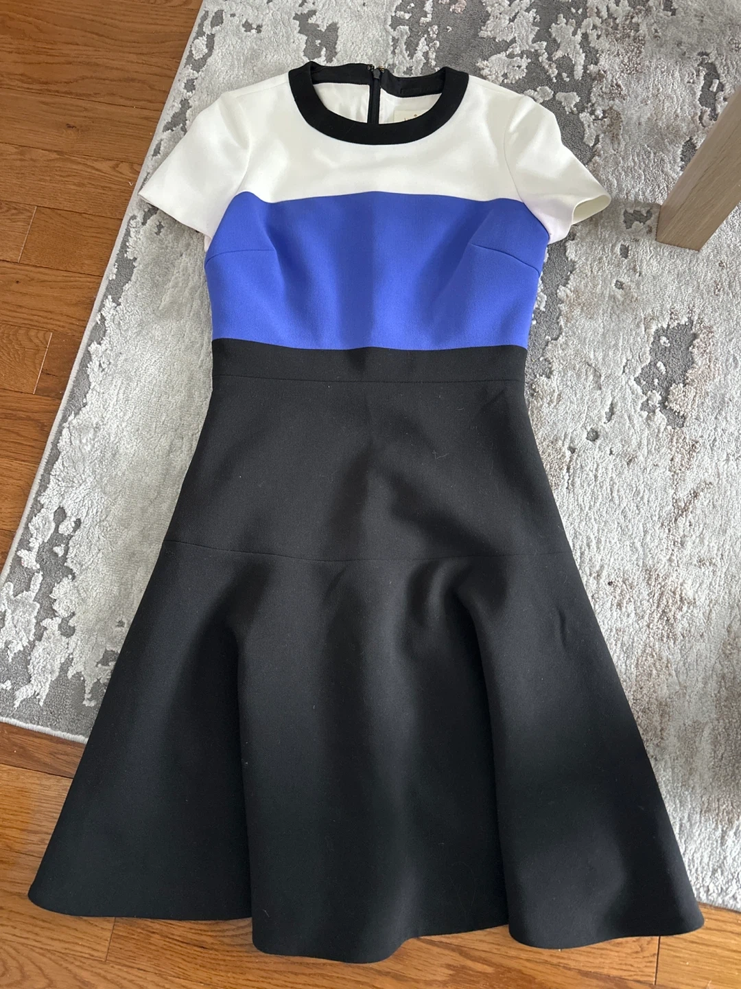 This is a Kate Spade colorblock dress. It's a size 2 and features a fit and flare silhouette. The dress is made of a fabric that drapes nicely.