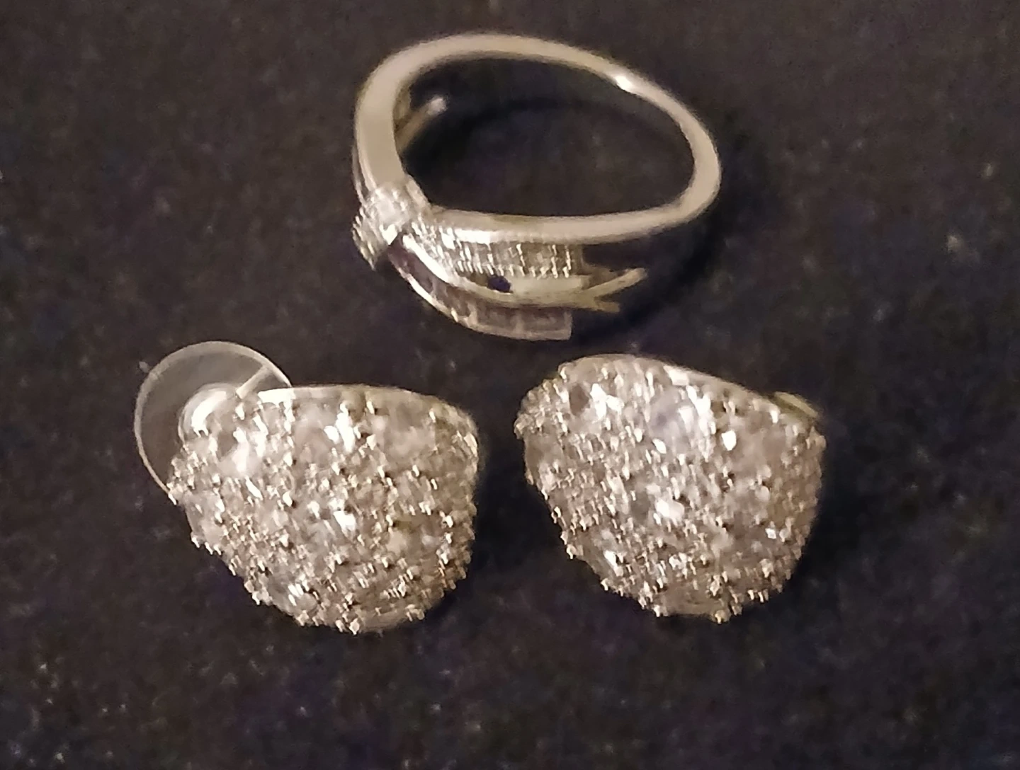 Sparkly rhinestone ring and matching stud earrings. This set is silver-toned and perfect for adding a touch of glamour. Great for dressing up any outfit!