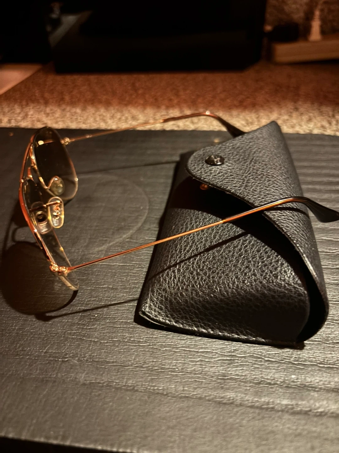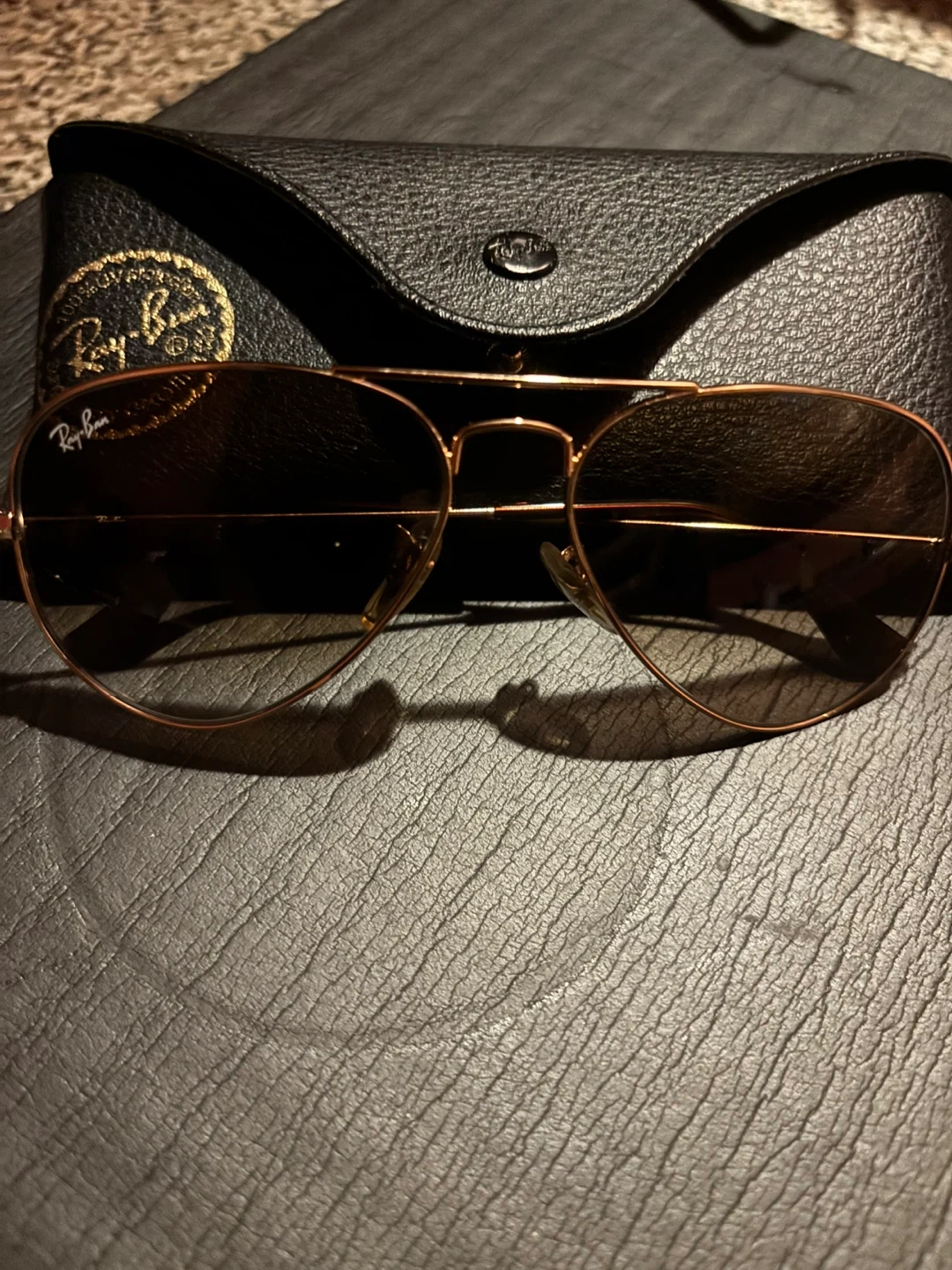 Ray-Ban aviator sunglasses with a rose gold frame and gradient brown lenses. Includes a black leather case with the Ray-Ban logo. A classic accessory for sunny days!