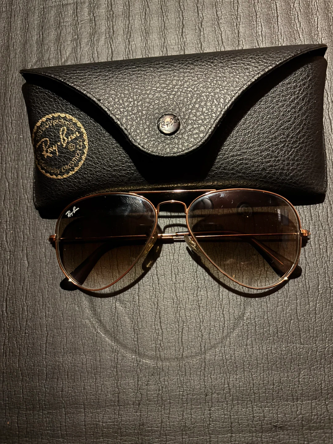 Ray-Ban aviator sunglasses with a rose gold frame and gradient brown lenses. Includes a black leather case with the Ray-Ban logo. A classic accessory for sunny days!