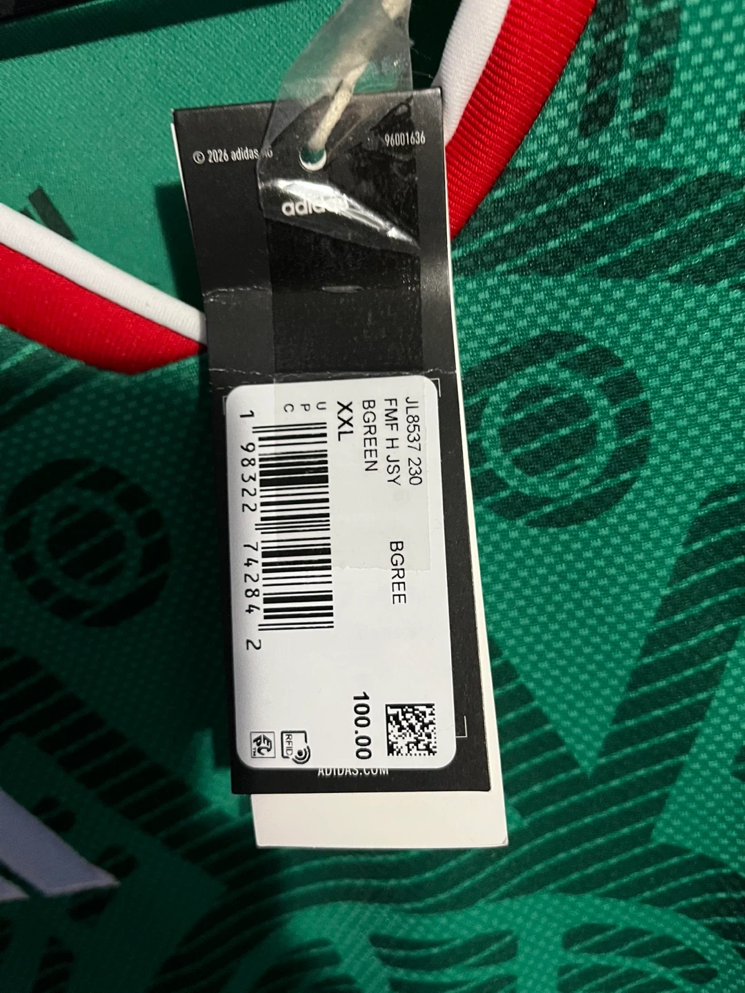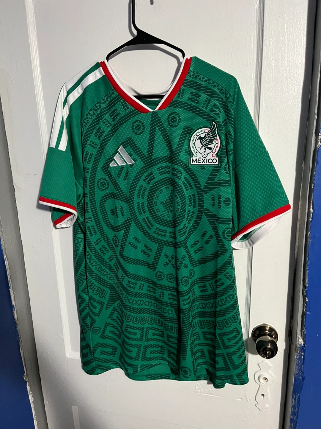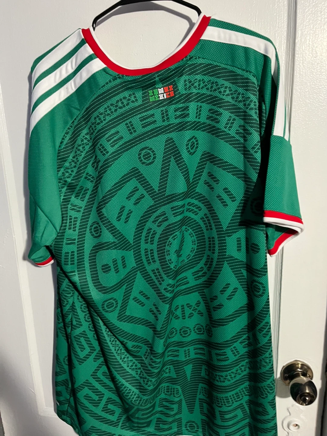 Adidas Mexico national team soccer jersey in green and white. It's size XXL and features a bold geometric pattern. This shirt has the Mexico team crest and Adidas logo on the front.