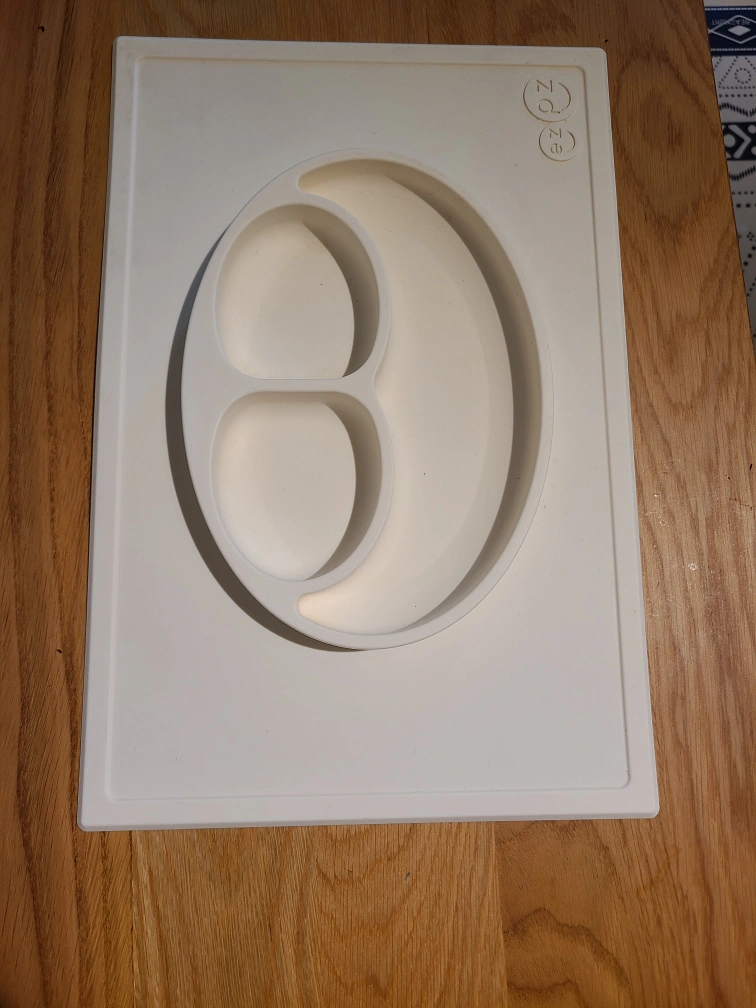 Selling a gently used ezpz Mini Mat in white! It's a lifesaver for meal times with little ones. The all-in-one placemat + plate suctions directly to the table, making it nearly impossible for tiny hands to tip over. Perfect for babies and toddlers!
