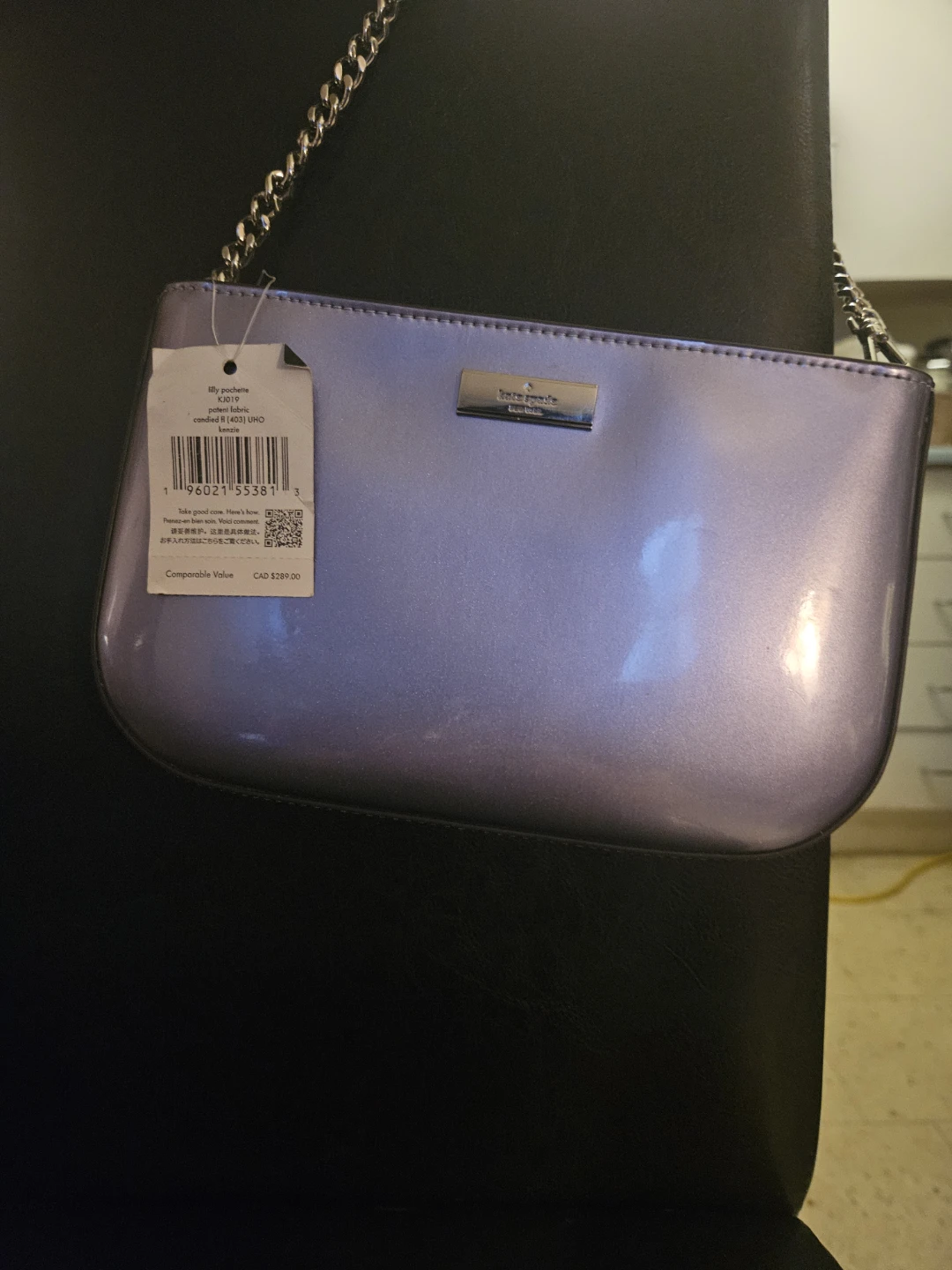 This is a Kate Spade Lilly Pochette in a patent fabric finish. The colour is a shimmery pastel purple. It has a silver chain strap.