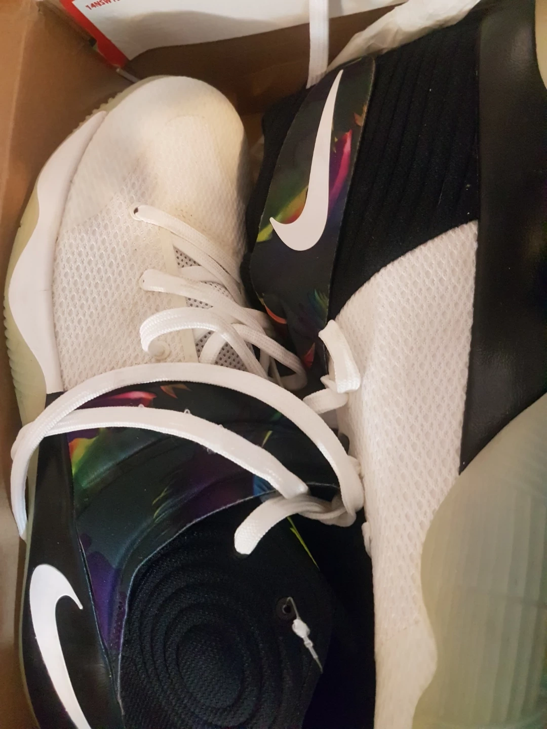 These Nike Kyrie 2 "PARADE" Basketball shoes come in a black and white colourway with a vibrant multi-coloured accent. They're designed for quick cuts and dynamic play on the court. Lace-up closure for a secure fit.