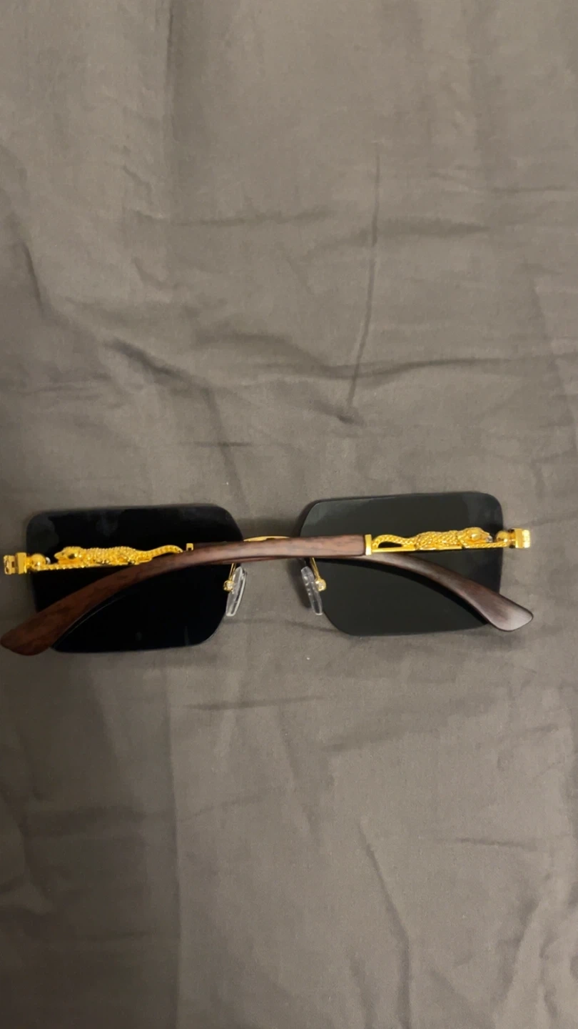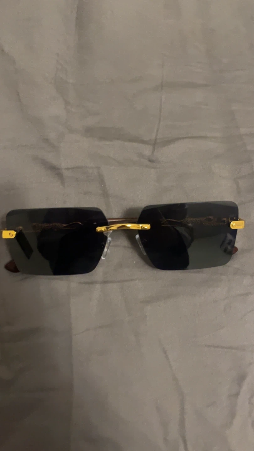 These stylish rimless sunglasses feature dark tinted lenses and gold-toned hardware with a distinctive panther design.