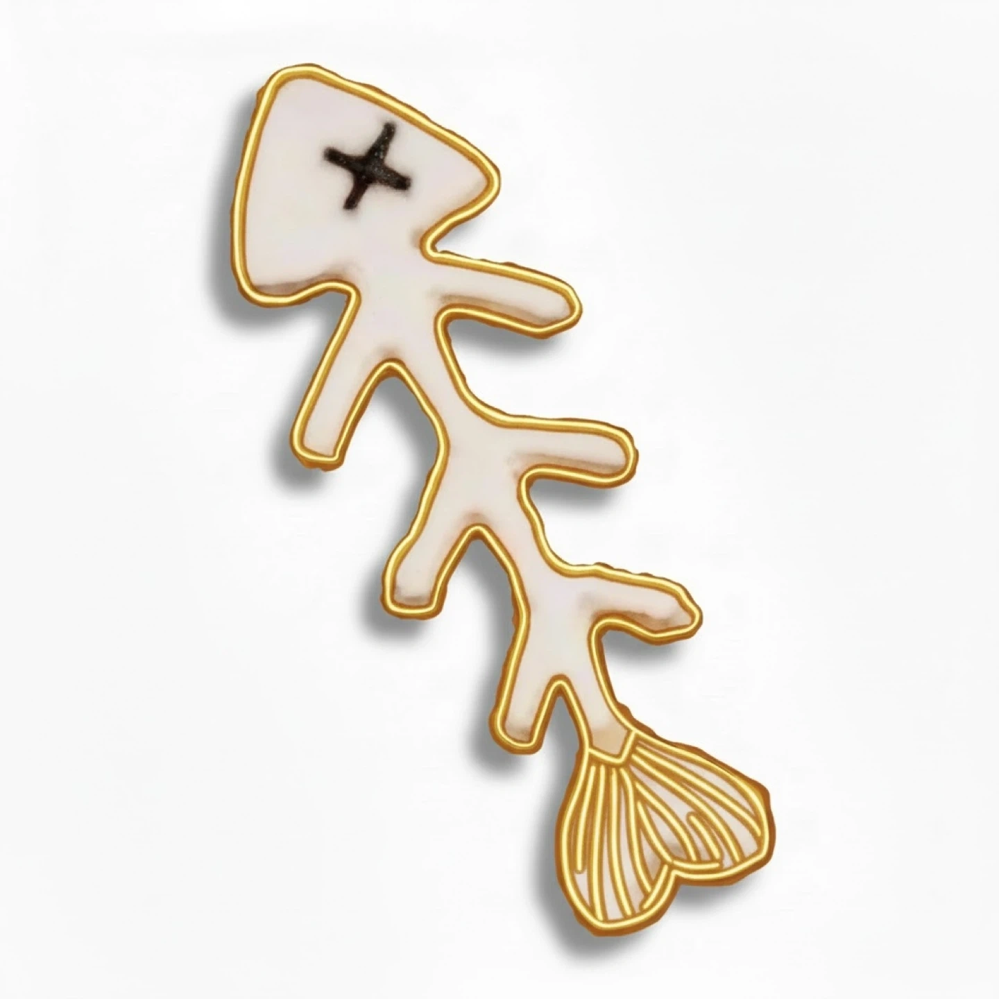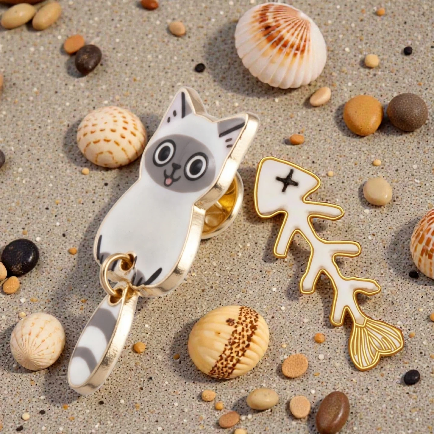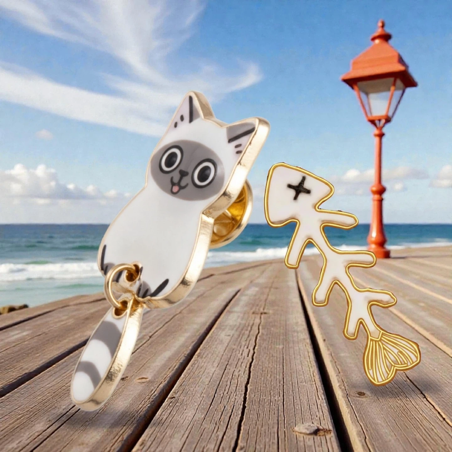 Features a playful cat with a dangling tail and a fish skeleton. Metal pin backing.