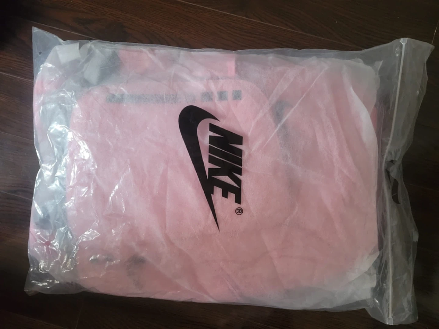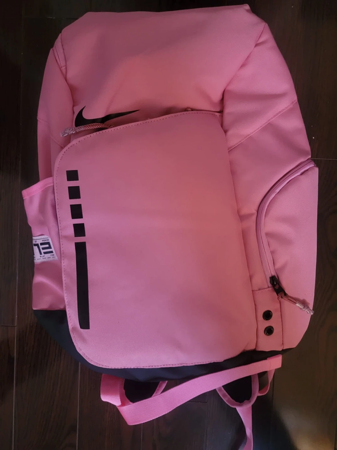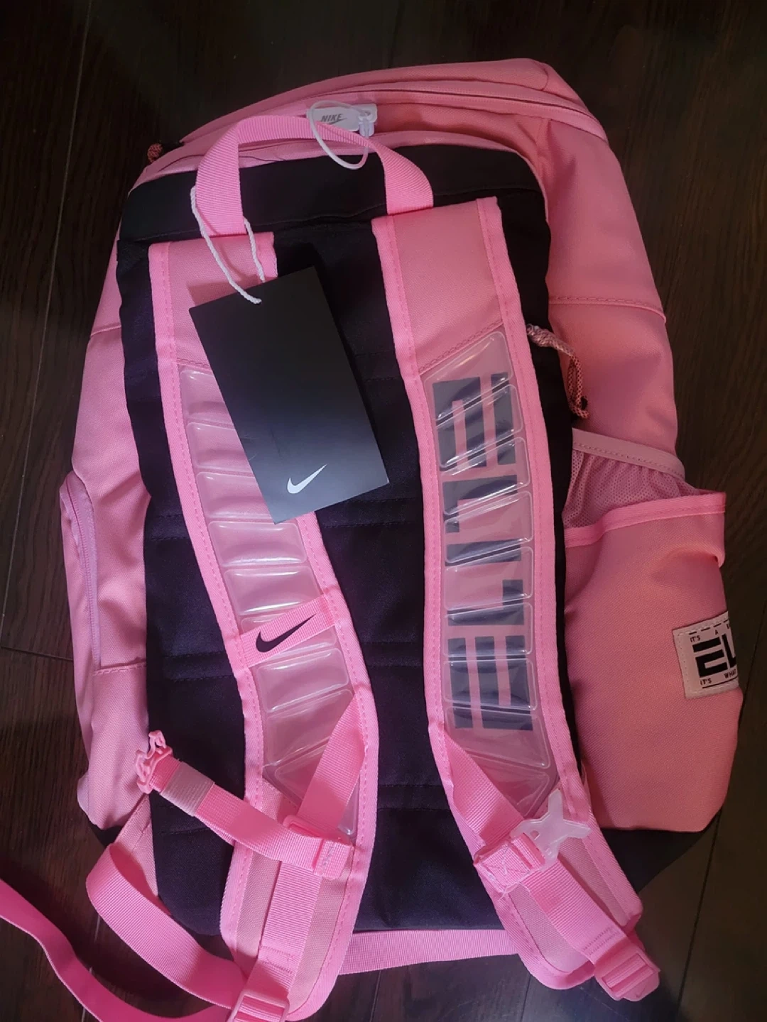It's a pink Nike backpack with a large main compartment and a front pocket. It has adjustable padded shoulder straps and side mesh pockets. This bag's ideal for carrying your gear to practice or school!