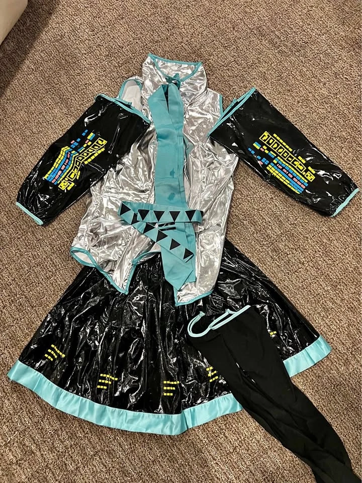 Brand new cosplay costume in size Medium. Includes top, skirt with broken zipper, sleeves, tie, and stockings. Great for cosplay or Halloween party. Black grey wig for cosplay.