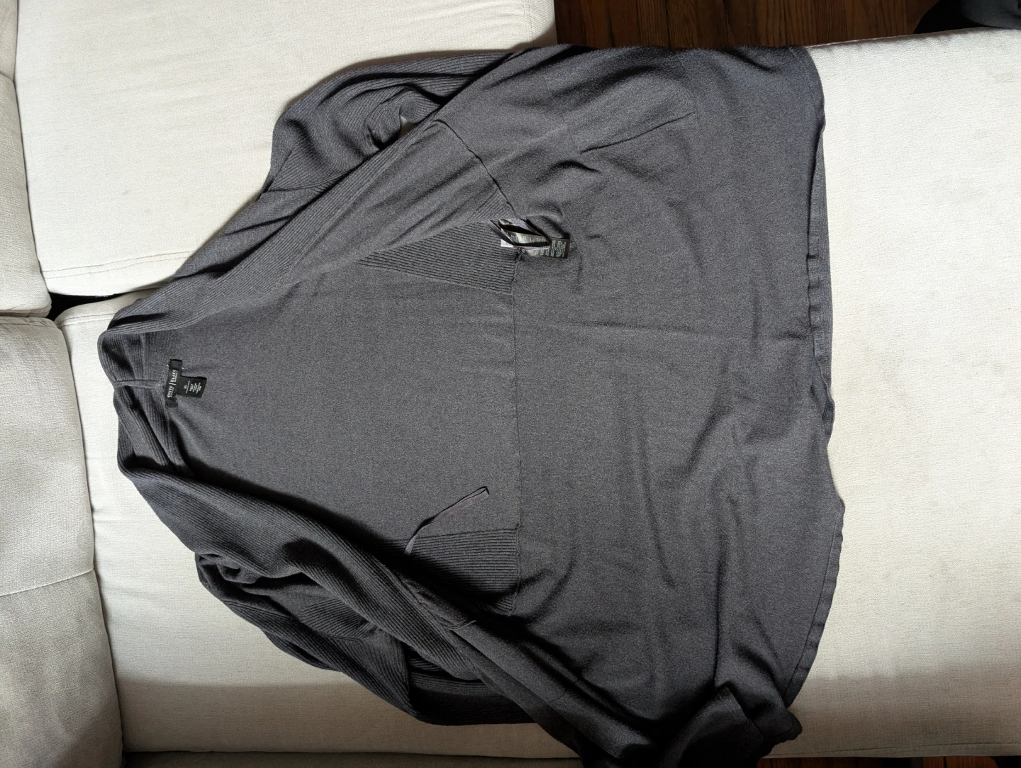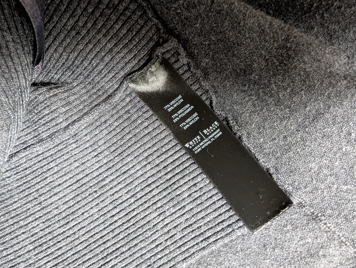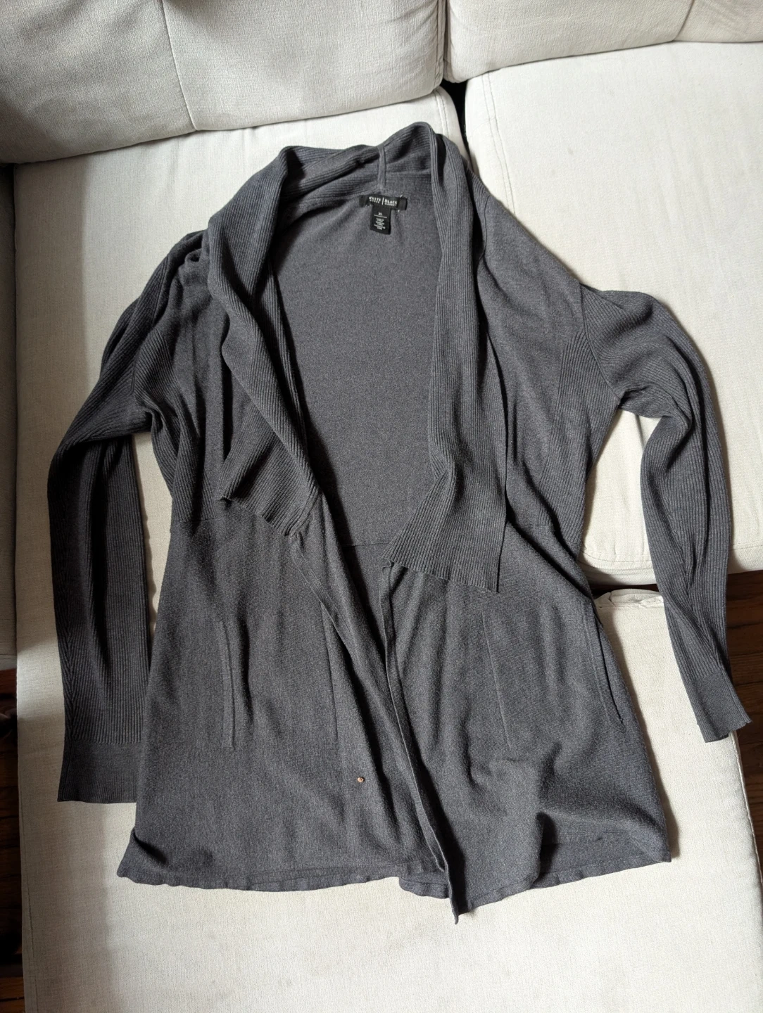 Cozy grey cardigan from White House Black Market. It's made with a blend of 77% viscose, 20% nylon, and 3% polyamide. Includes two front pockets.