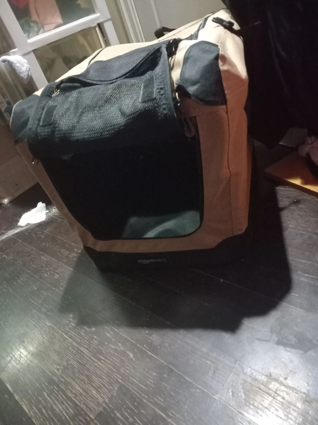 This is an AmazonBasics pet carrier bag. It's made of durable fabric and features mesh ventilation panels for airflow. It has a zippered top and side openings for easy access. Suitable for small pets.