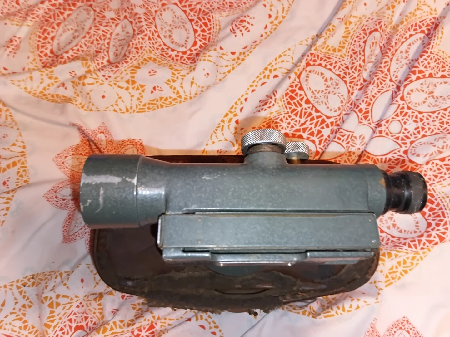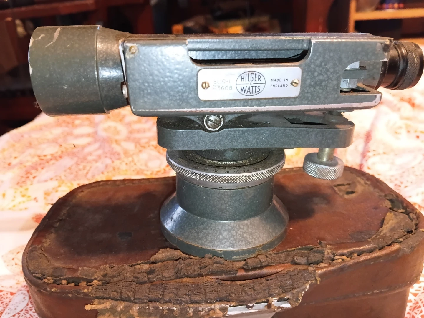 This is a Hilger & Watts SLI0-1 surveying level, made in England. It's a vintage instrument with a metal body and comes with its original leather case. This level is useful for precise land measurements and construction projects.