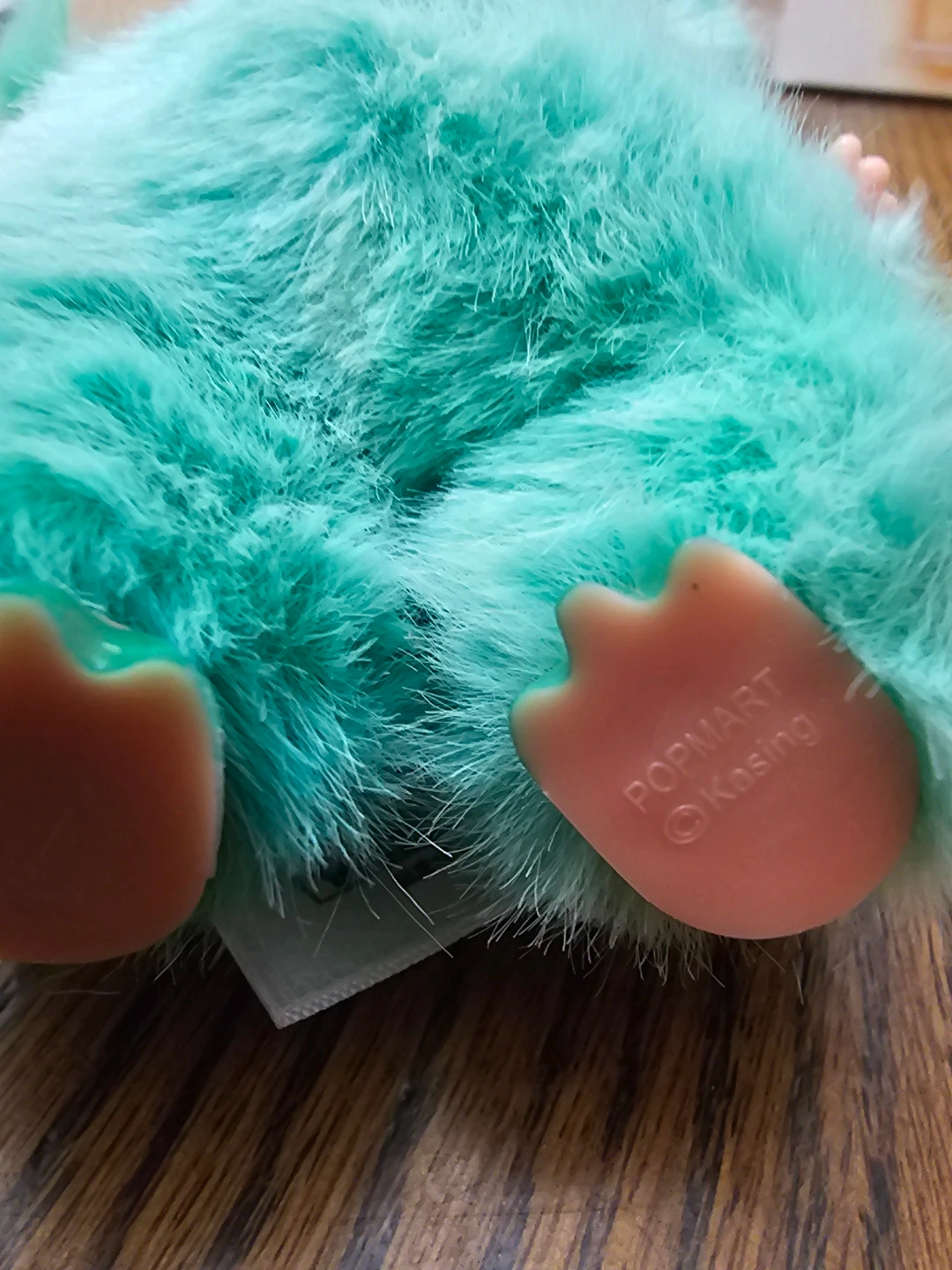 This is a Pop Mart Kasing Lunar Monster plush keychain. It's a fuzzy teal monster with a happy smile and big green eyes. It comes with a loop for attaching to bags or keys.