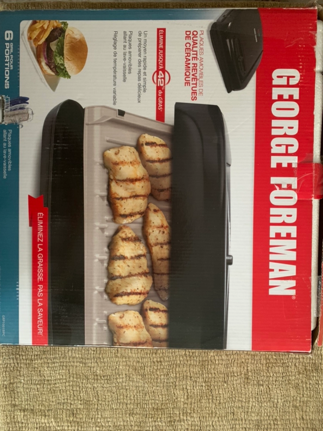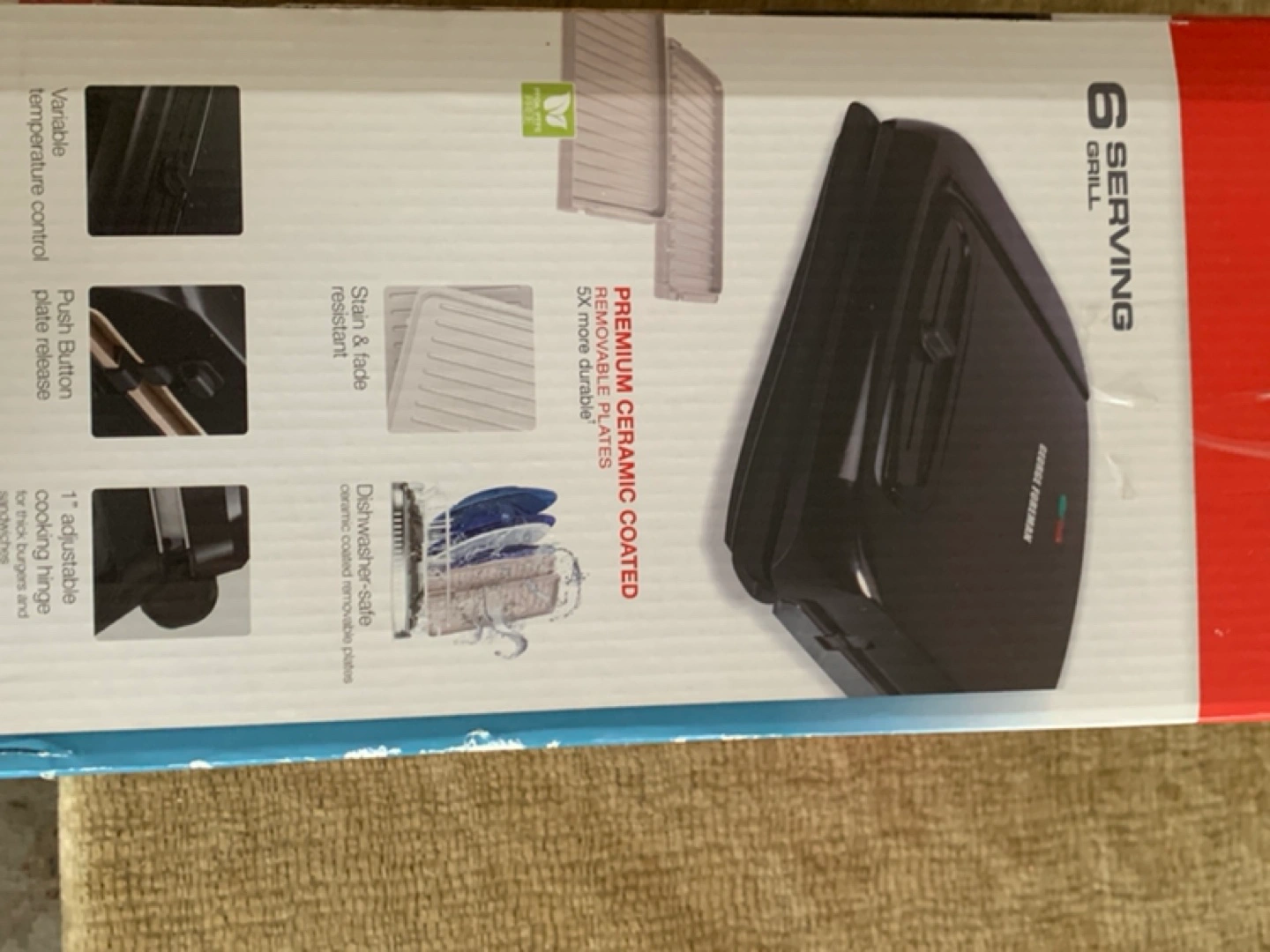 Black electric indoor grill with removable ceramic-coated plates. Variable temperature control and adjustable hinge. Dishwasher-safe plates.