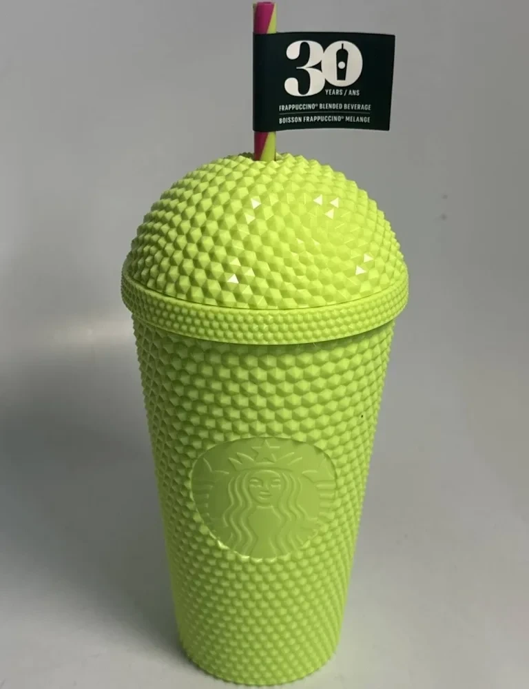 This is a limited edition Starbucks tumbler celebrating their 30th anniversary. It features a vibrant lime green colour and a unique studded texture all over. The tumbler comes with a matching straw and a small flag detail indicating the anniversary.