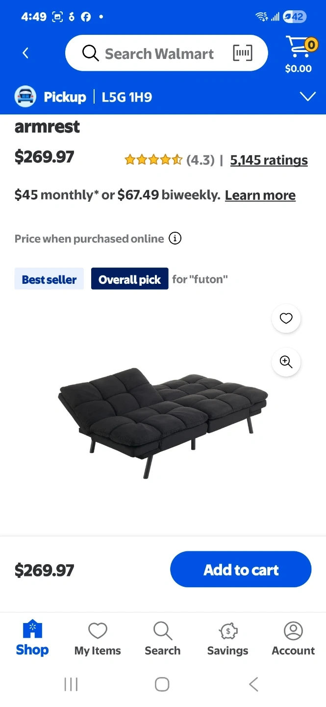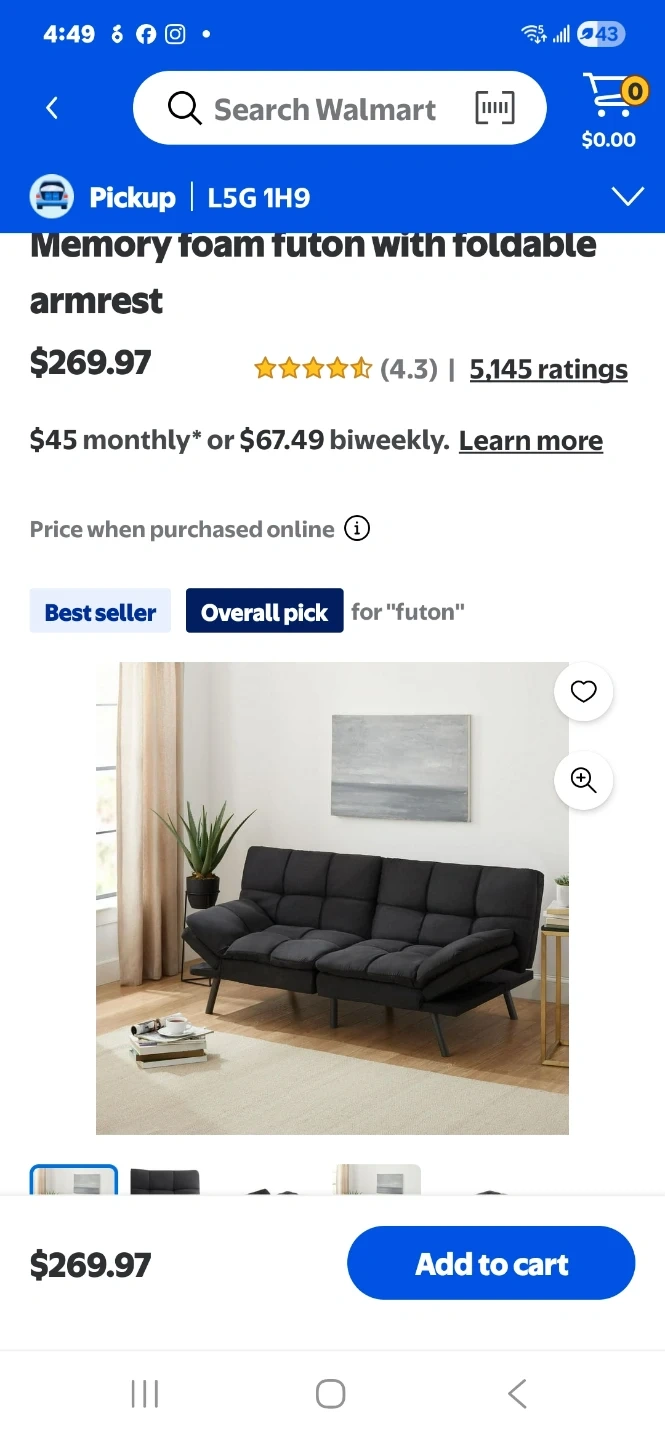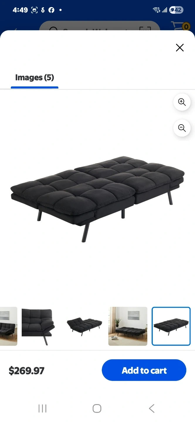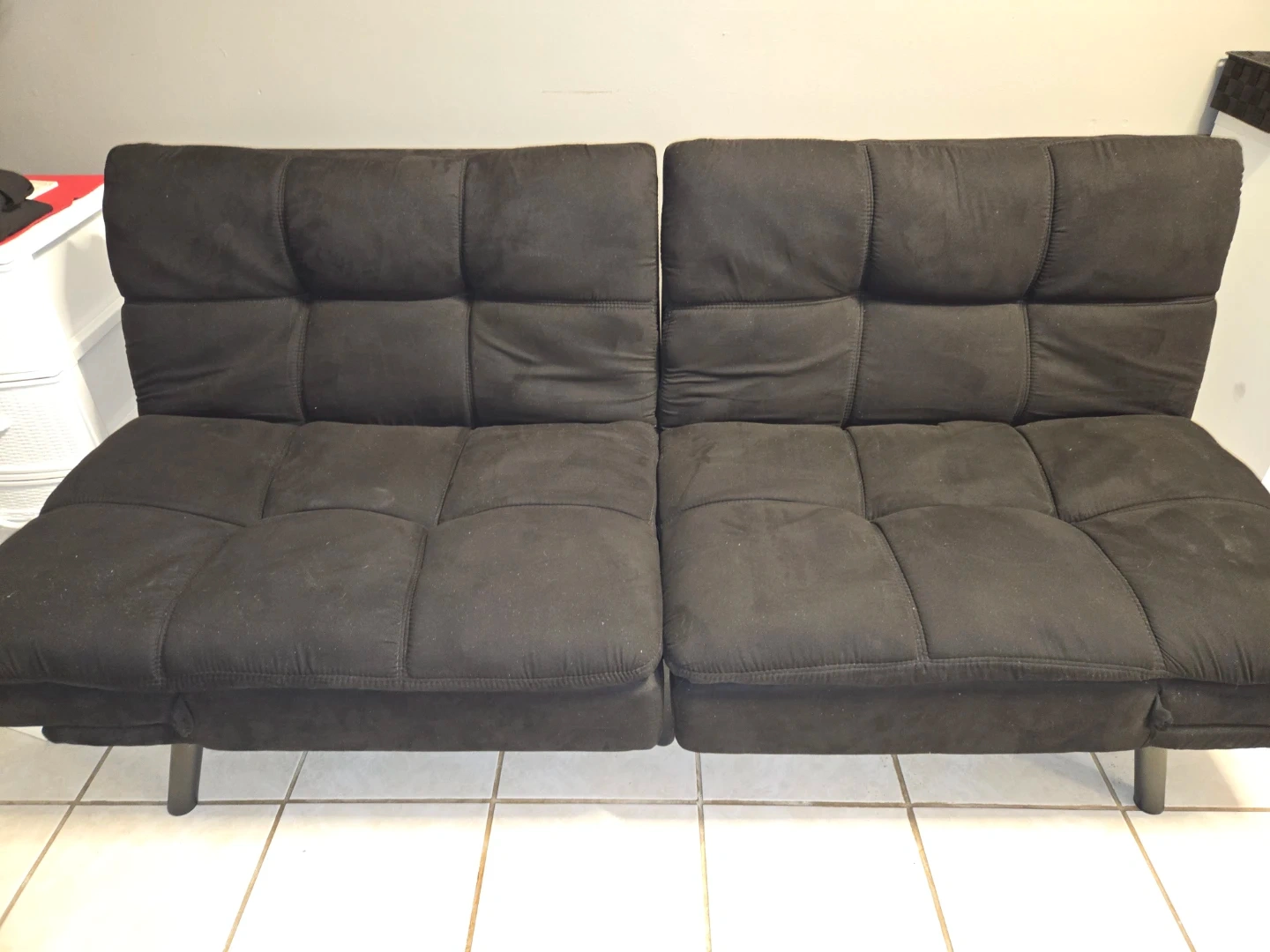 This memory foam futon converts into a bed with foldable armrests. It's upholstered in black fabric with a tufted design. This futon offers a space-saving solution for small apartments or guest rooms.
