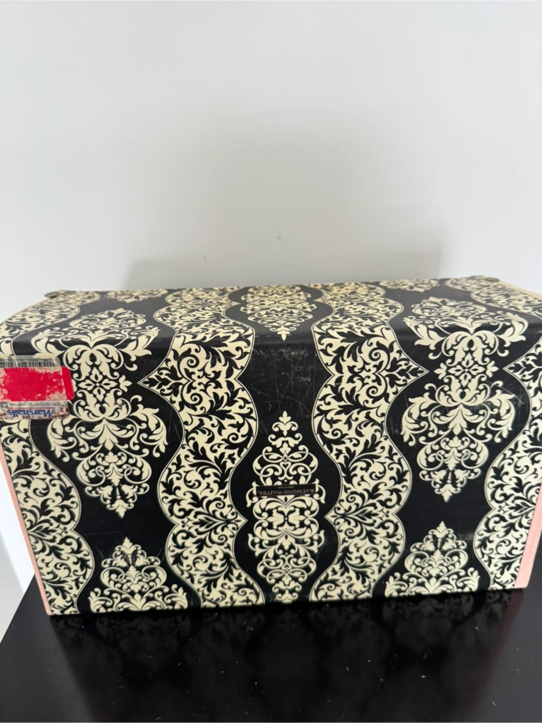 This is a decorative vanity case with a vintage-inspired black and cream damask pattern. It's ideal for storing jewelry or small accessories. The interior lining features a repeating 'Style is Forever COUTURE' print.