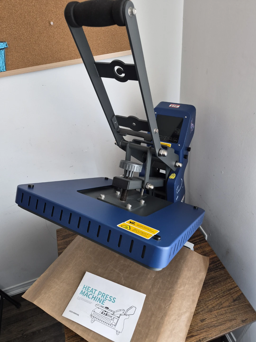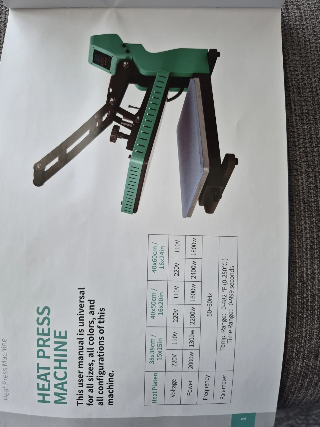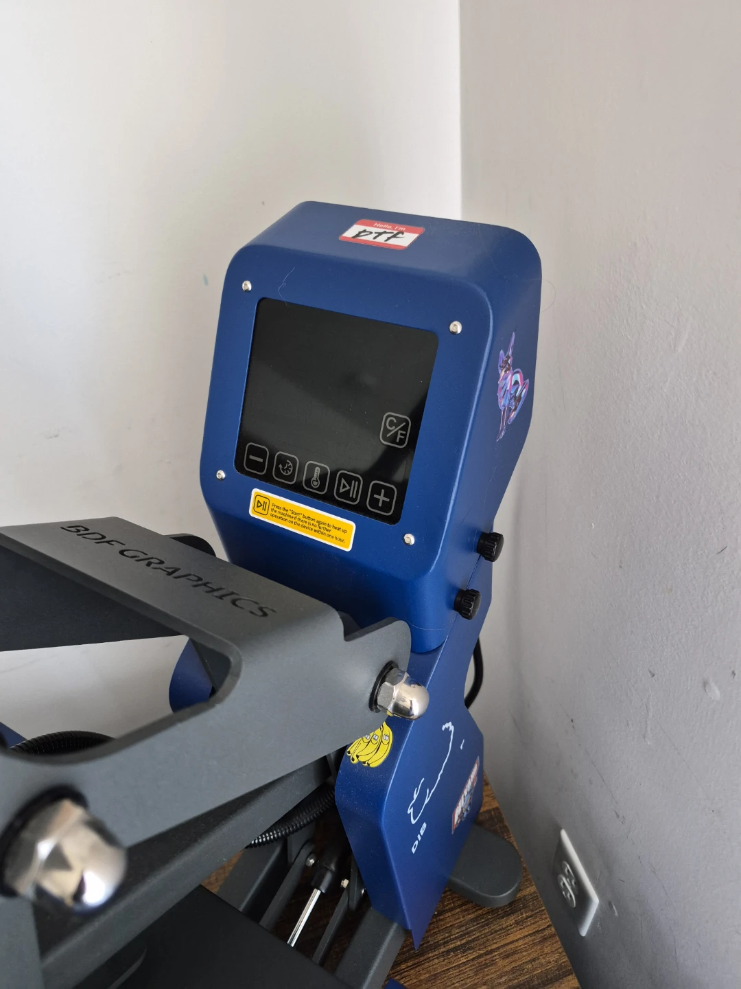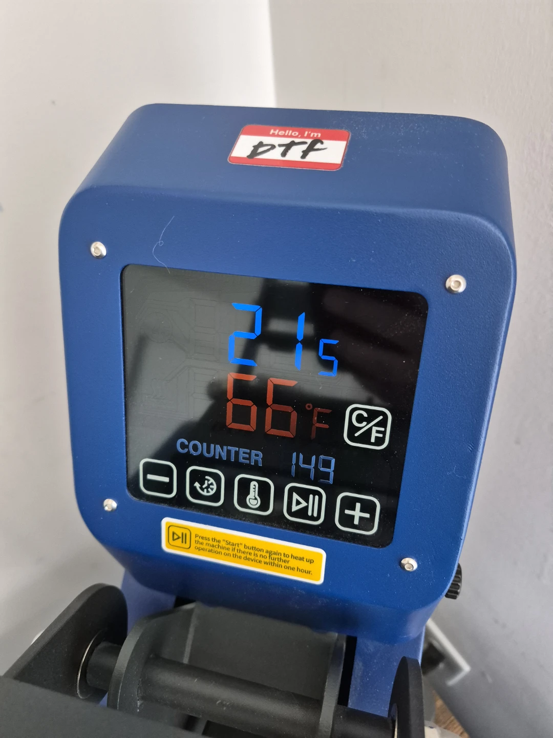 This is a blue DPF heat press machine. It's designed for all sizes, colours, and configurations. Temperature range is 0-482°F and time range is 0-999 seconds.