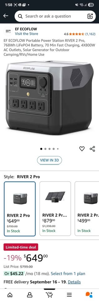768Wh/1600 Watts LiFePO4 Battery, 70 Min Fast Charging, 4x800W AC Outlets, Solar Generator for Outdoor Camping/RVs/Home Use. Multiple units available. Multi-piece discounts available. Retails on Amazon for $700+. 9 more in stock.