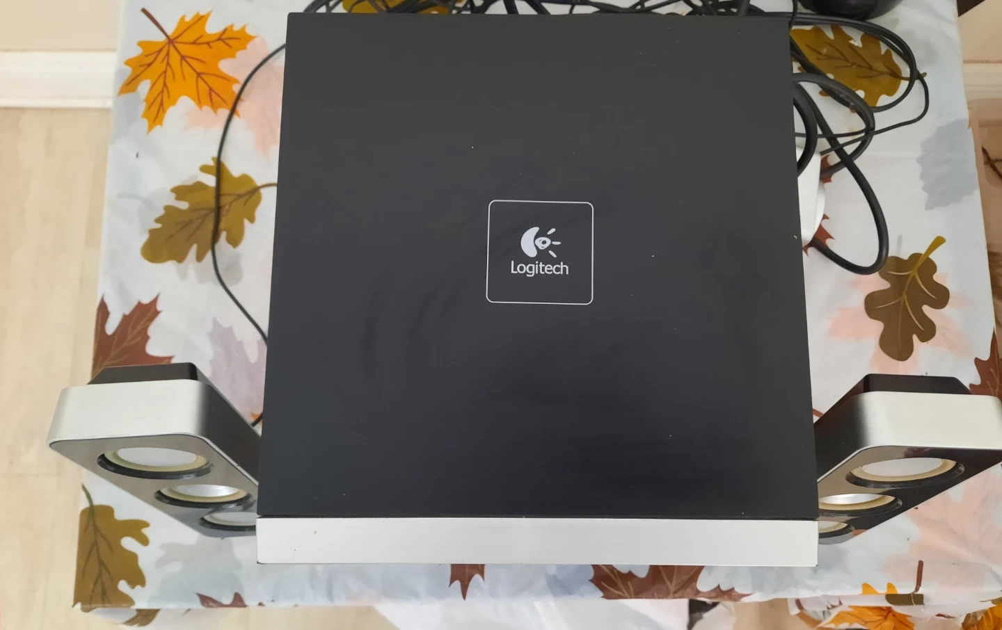 This is a Logitech Z4 2.1 speaker system. It includes a subwoofer and two satellite speakers. The system has a sleek black and silver design.