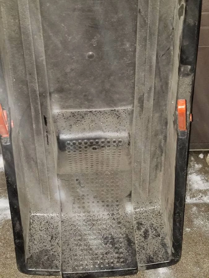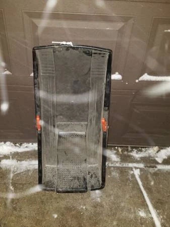 Selling a black sled with orange handles! It's perfect for some winter fun. It has some signs of use, but it's still in good condition for sledding.