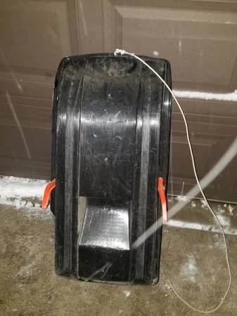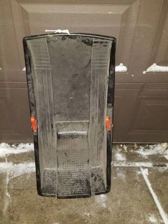 Selling a black sled with orange handles! It's perfect for some winter fun. It has some signs of use, but it's still in good condition for sledding.