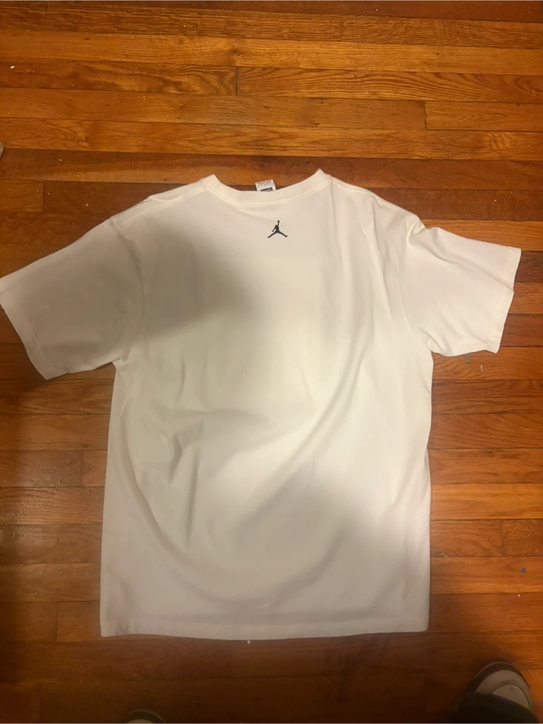Selling a Supreme Air Jordan T-shirt featuring Biggie Smalls. It's a size Large and in good condition. The shirt is white with a graphic print on the front and the Jumpman logo on the back. Perfect for any fan of Supreme or Air Jordan!