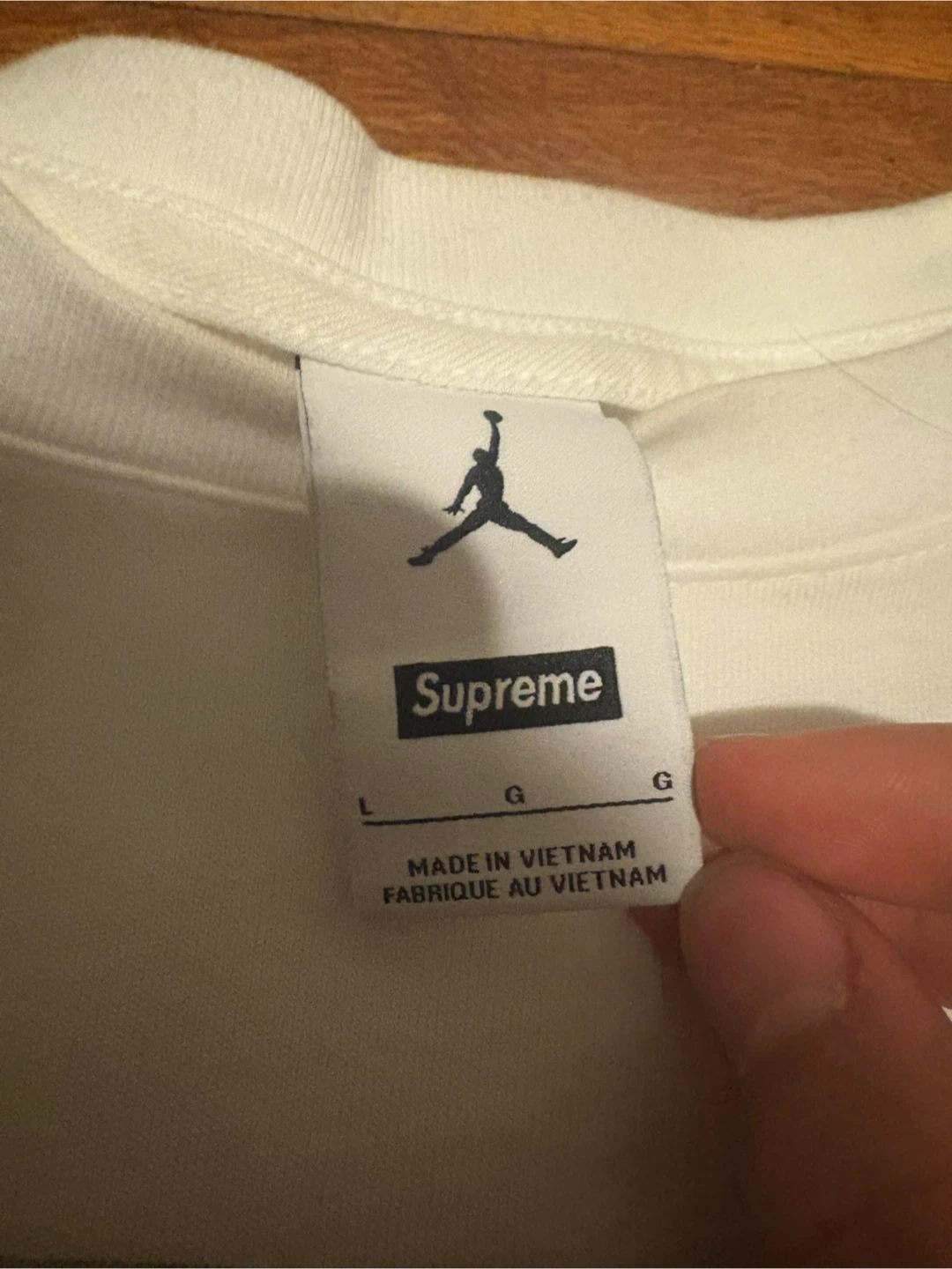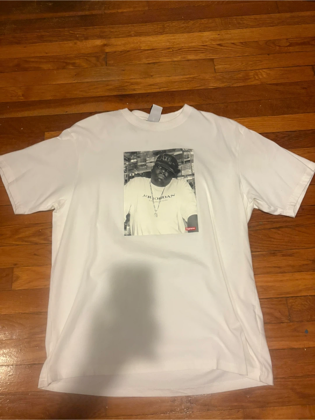 Selling a Supreme Air Jordan T-shirt featuring Biggie Smalls. It's a size Large and in good condition. The shirt is white with a graphic print on the front and the Jumpman logo on the back. Perfect for any fan of Supreme or Air Jordan!