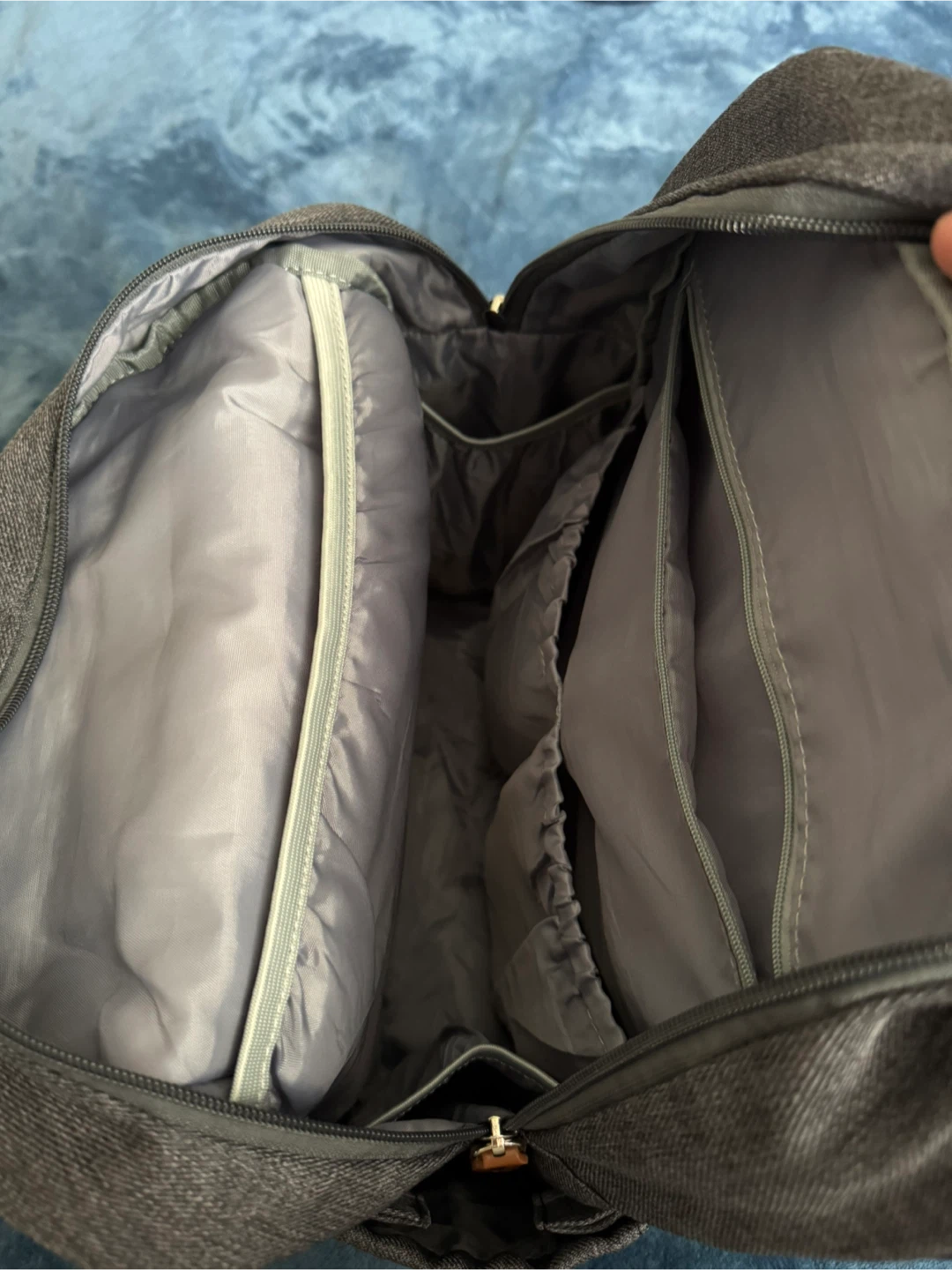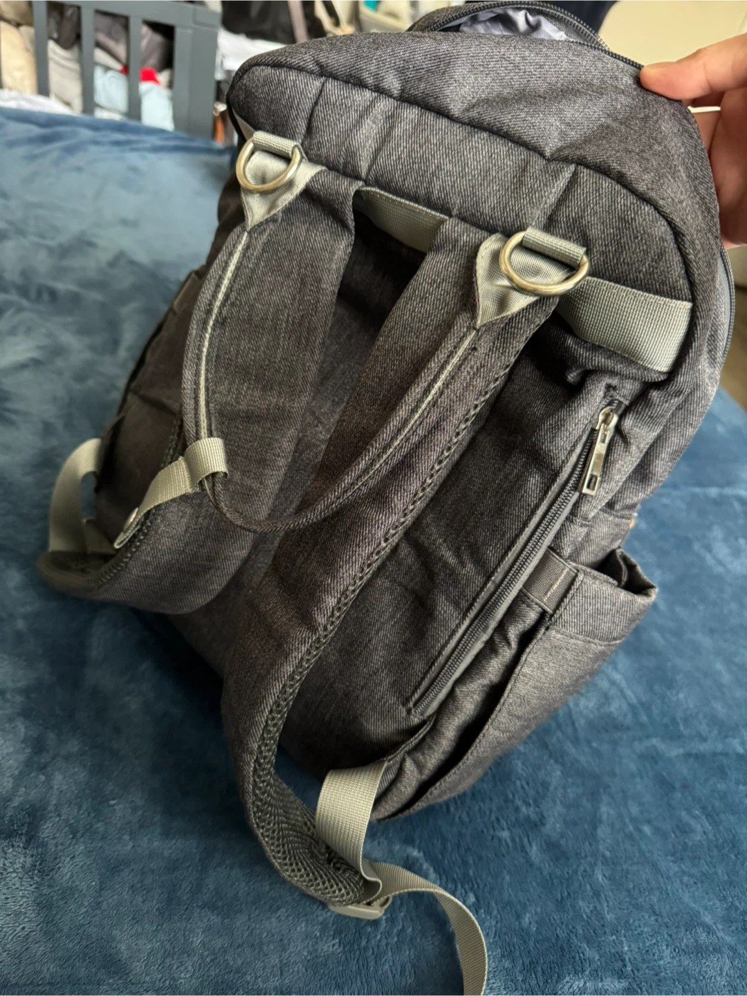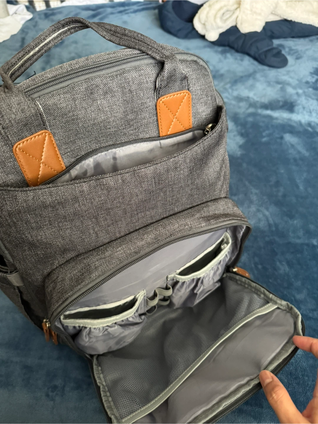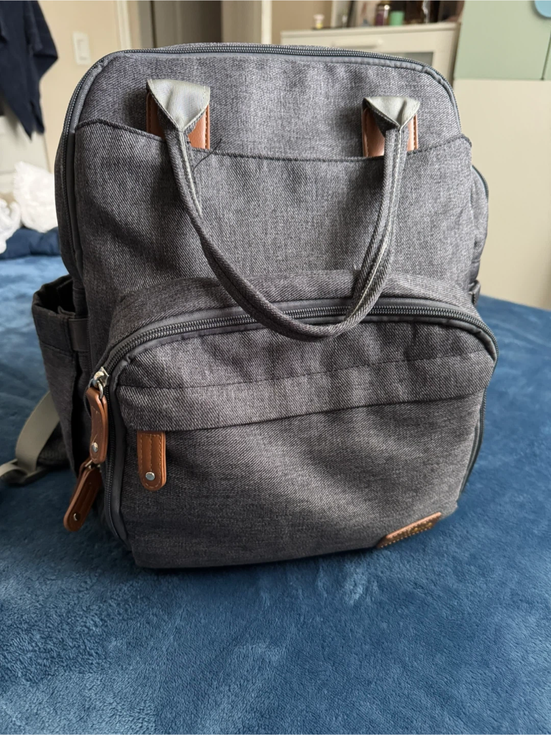 This is a gray diaper bag backpack. It has a lot of pockets and compartments for storage. It's perfect for carrying all of your baby's essentials!