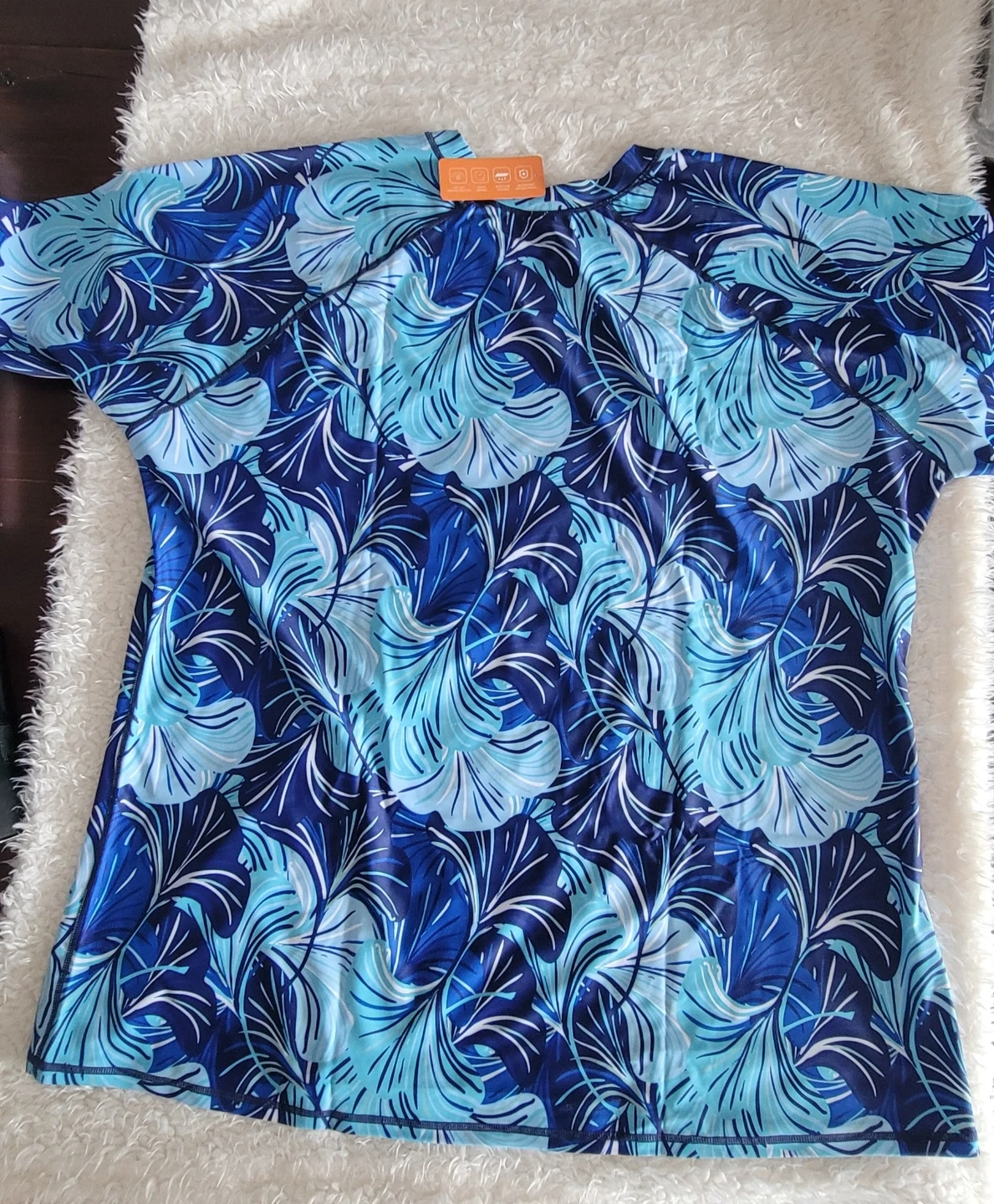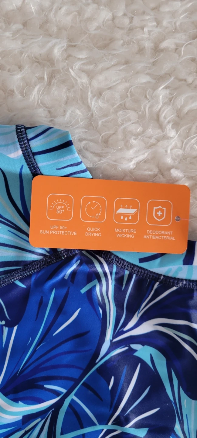 This brand-new ALLTOKE rash guard features a vibrant blue leaf print. It's made with a polyester and elastane blend for comfort and flexibility. UPF 50+ sun protection, quick drying, and moisture-wicking properties make it great for beach days or outdoor activities.