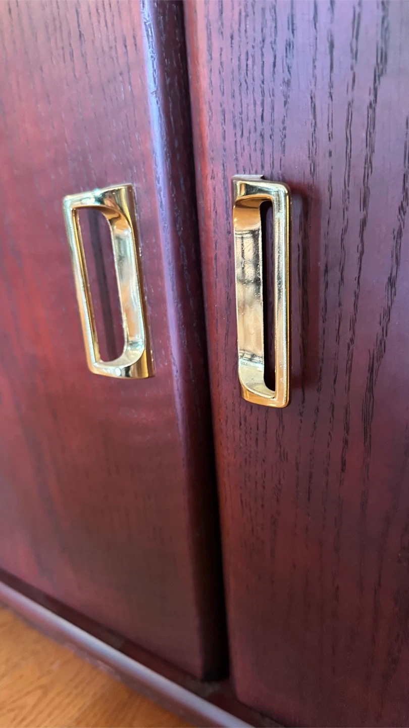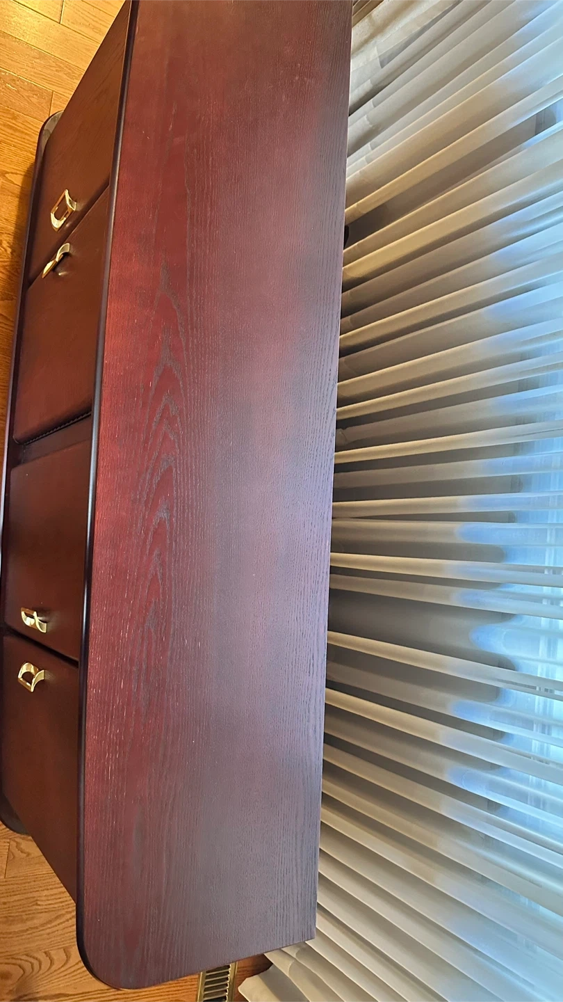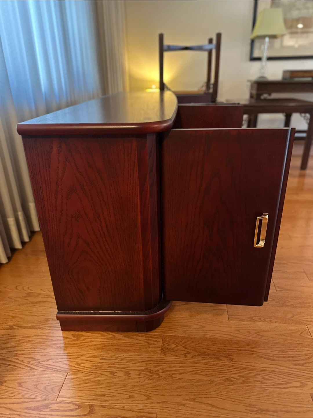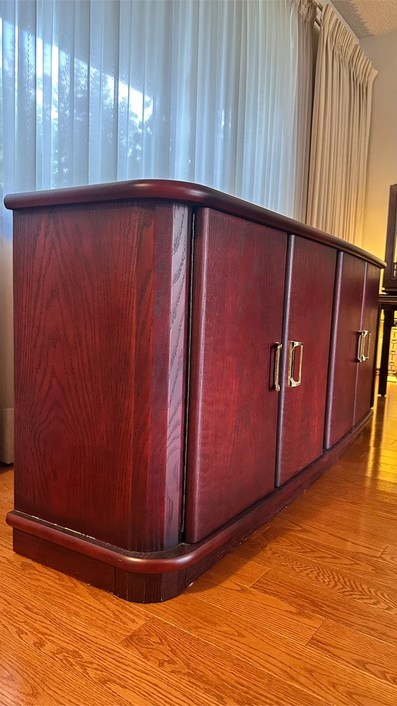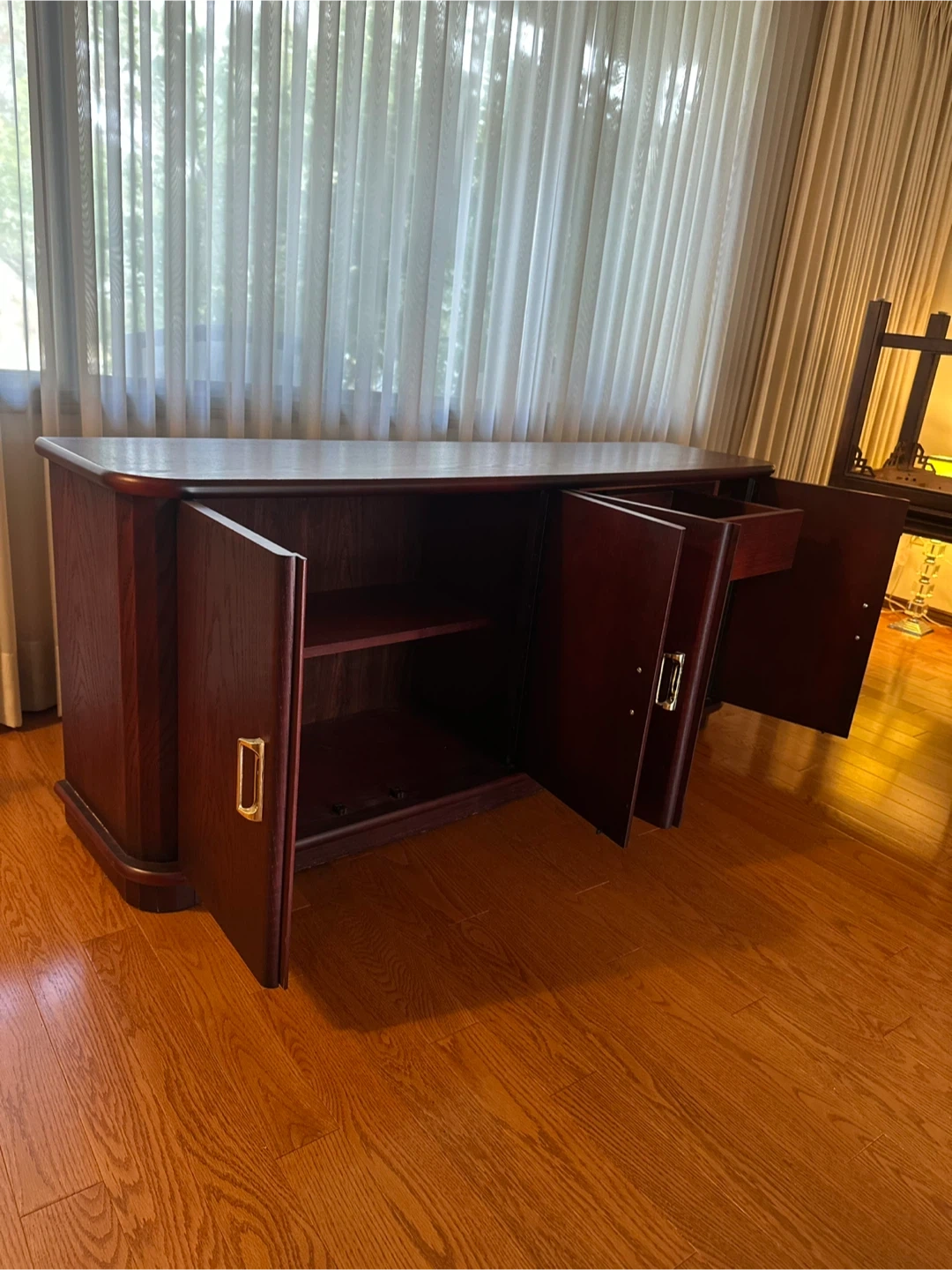 Selling a lovely credenza cabinet! It's made of a beautiful mahogany solid wood and has plenty of storage space with doors and drawers. Perfect for adding a touch of elegance to your dining or living room