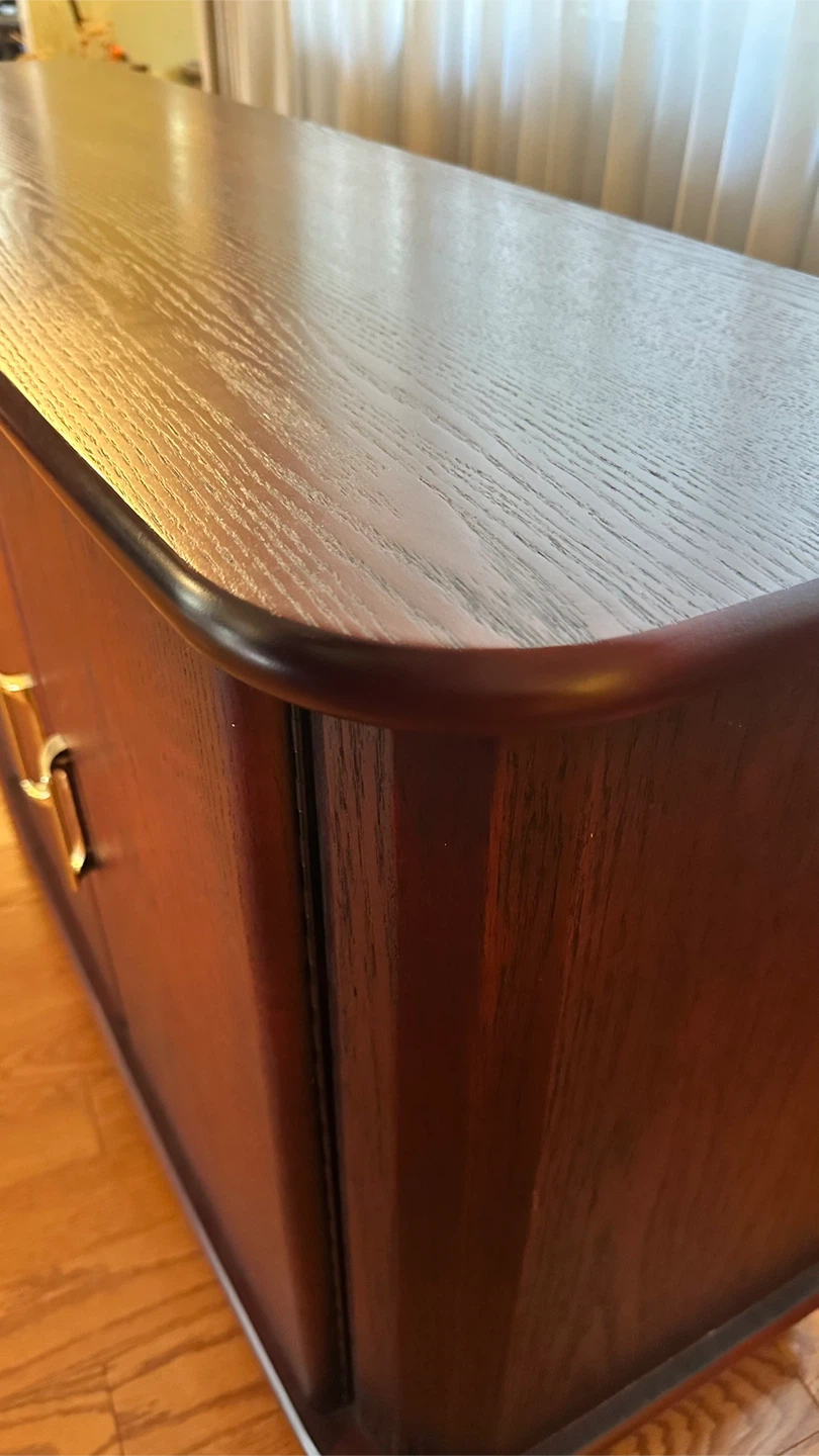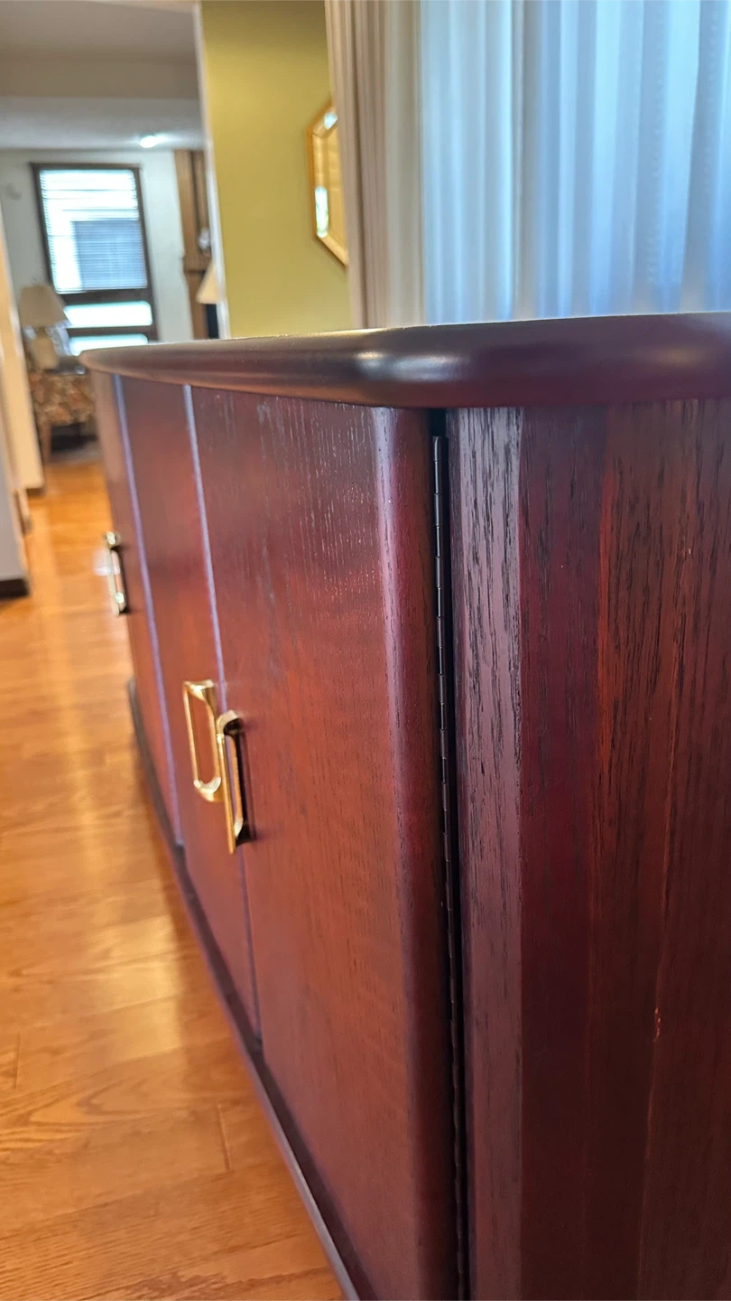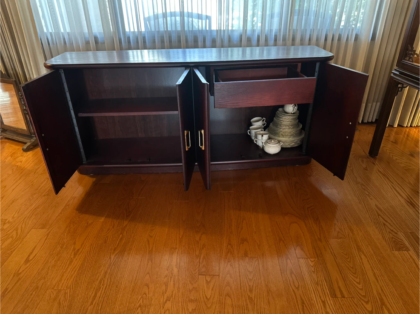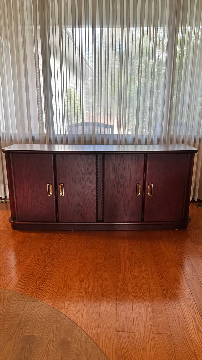 Selling a lovely credenza cabinet! It's made of a beautiful mahogany solid wood and has plenty of storage space with doors and drawers. Perfect for adding a touch of elegance to your dining or living room