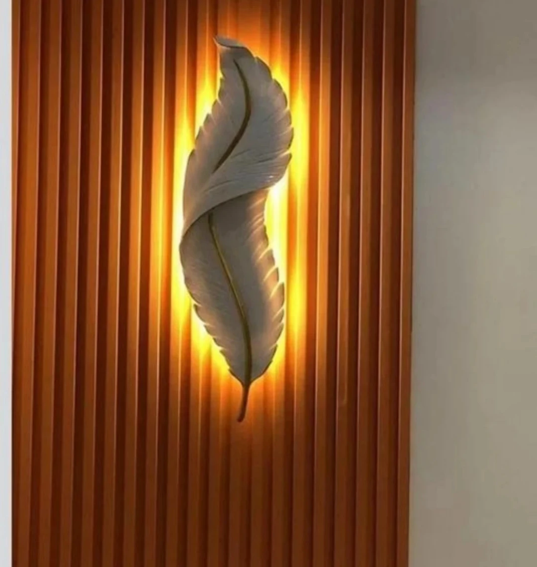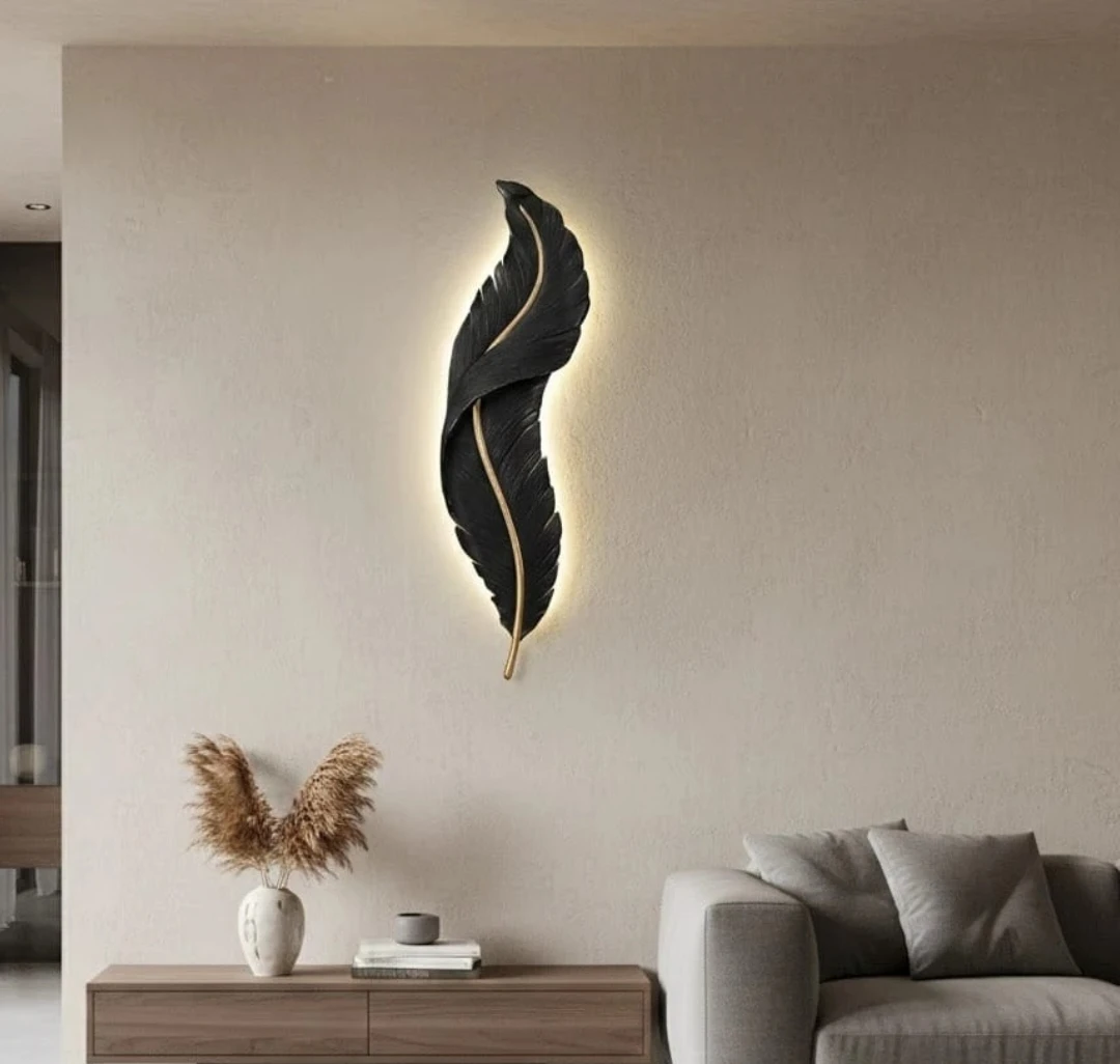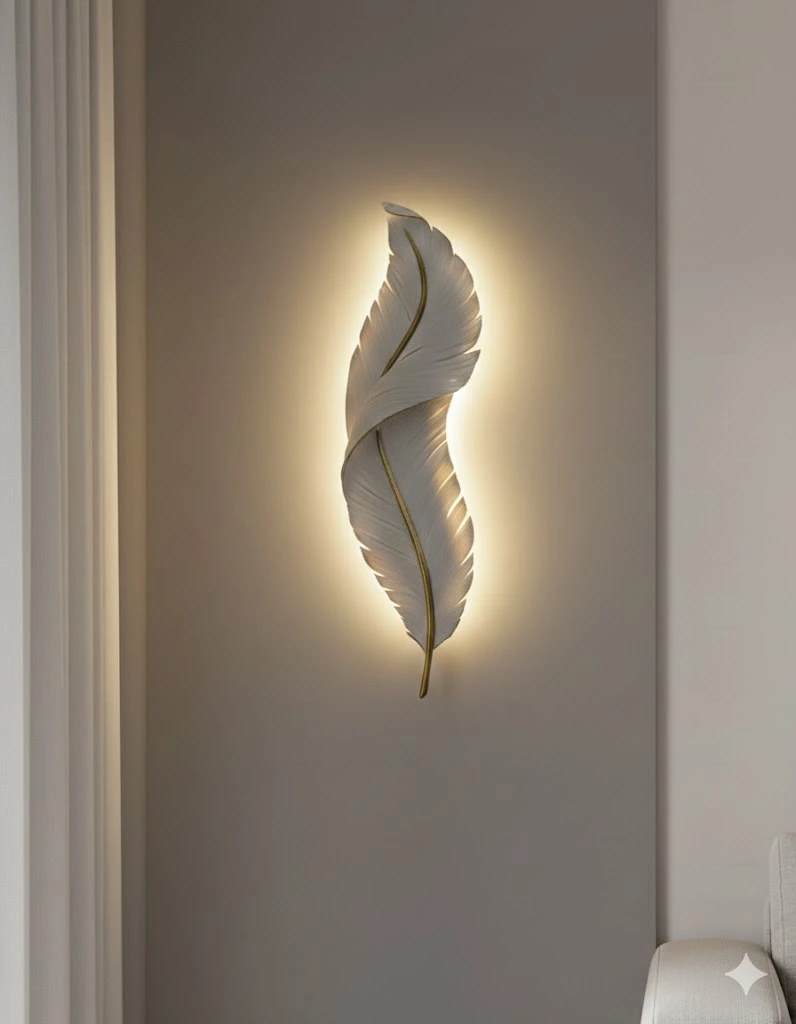 This decorative wall sconce features a unique feather design with integrated LED lighting. It's available in a black or white finish, with gold accents. This fixture adds a touch of modern artistry to any room.
