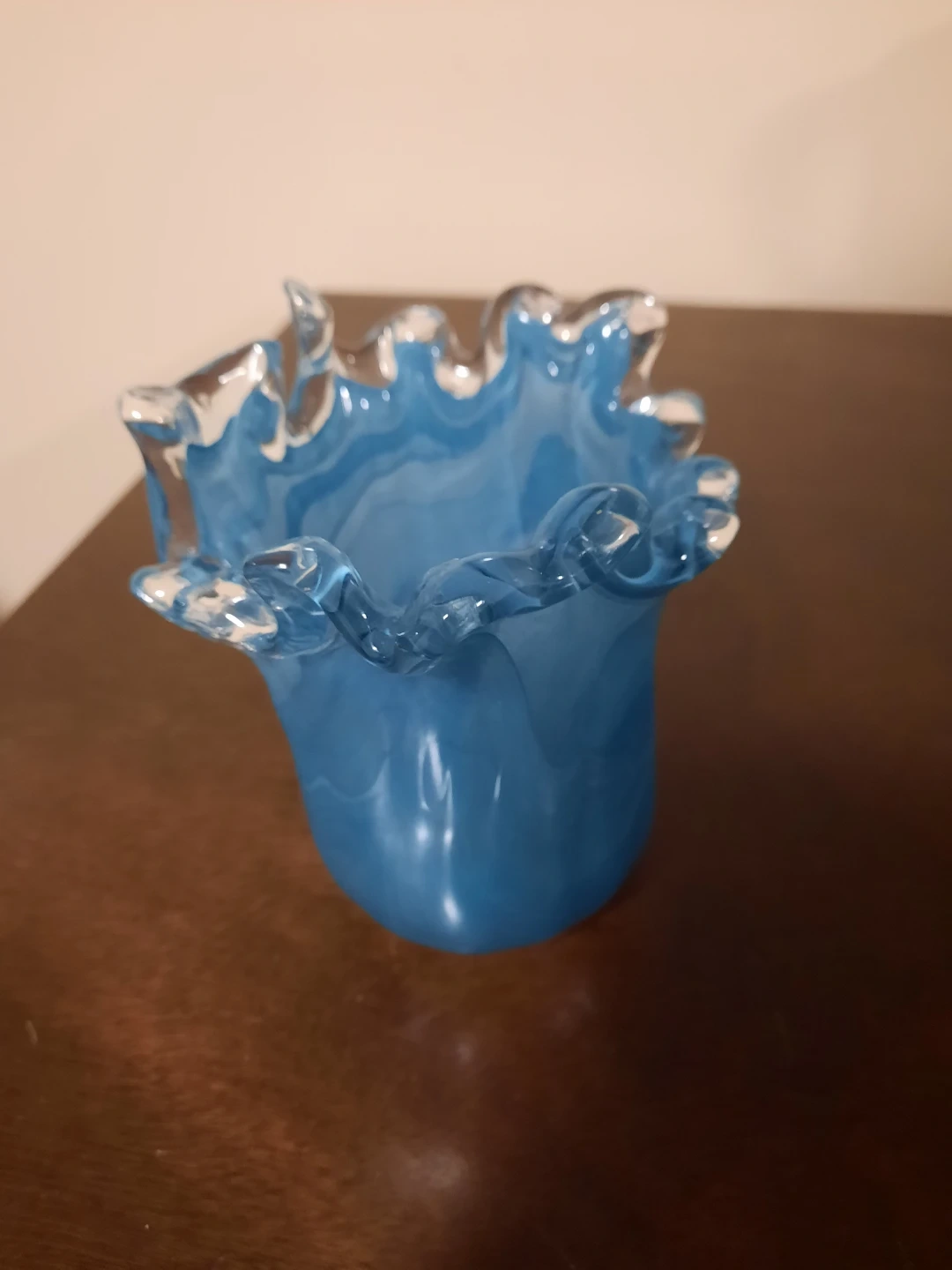 This is a beautiful blue glass vase with a ruffled top edge. It's made of glass and would make a lovely decorative piece. It's a great size for holding a small bouquet.