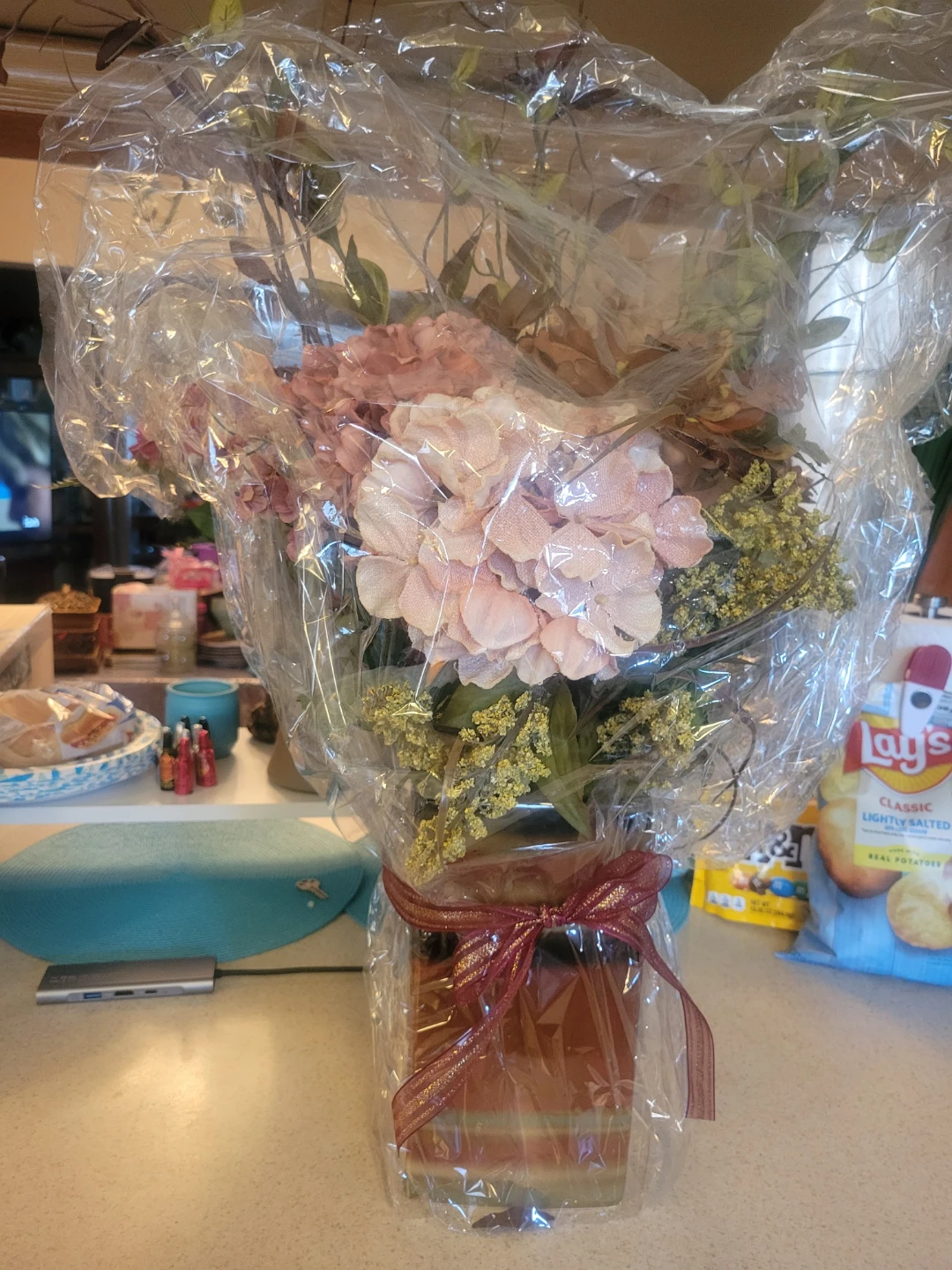 This is a beautiful artificial flower arrangement. It features pink and blush hydrangeas with greenery. The arrangement is housed in a decorative vase and wrapped for gifting. Perfect for home decor!