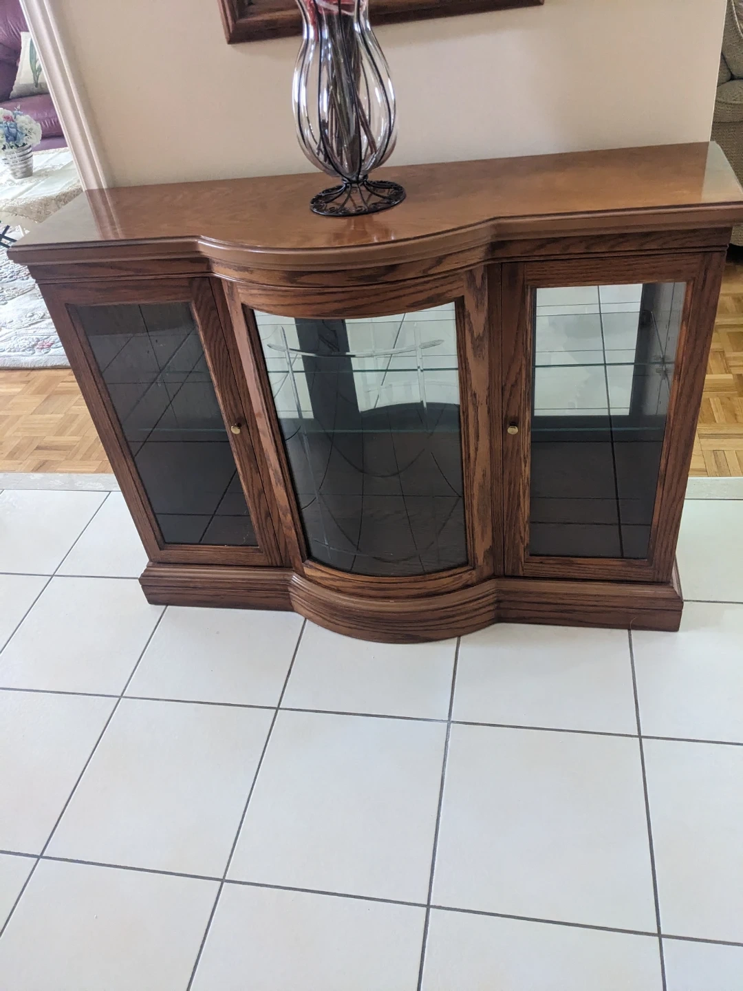 A lovely wooden display cabinet with glass doors. It has three sections, perfect for showcasing your collectibles or dishes. A beautiful piece for any living or dining area!