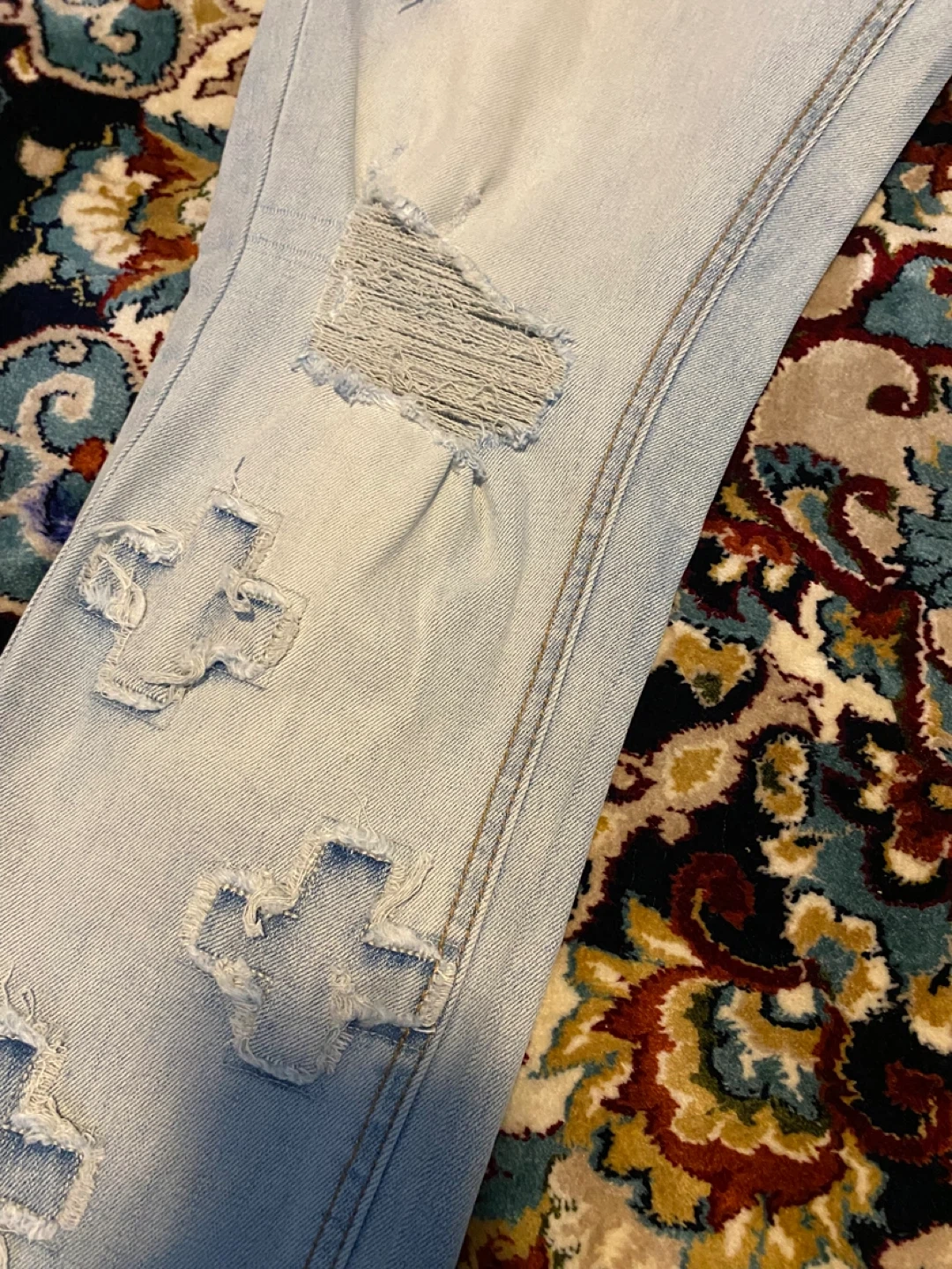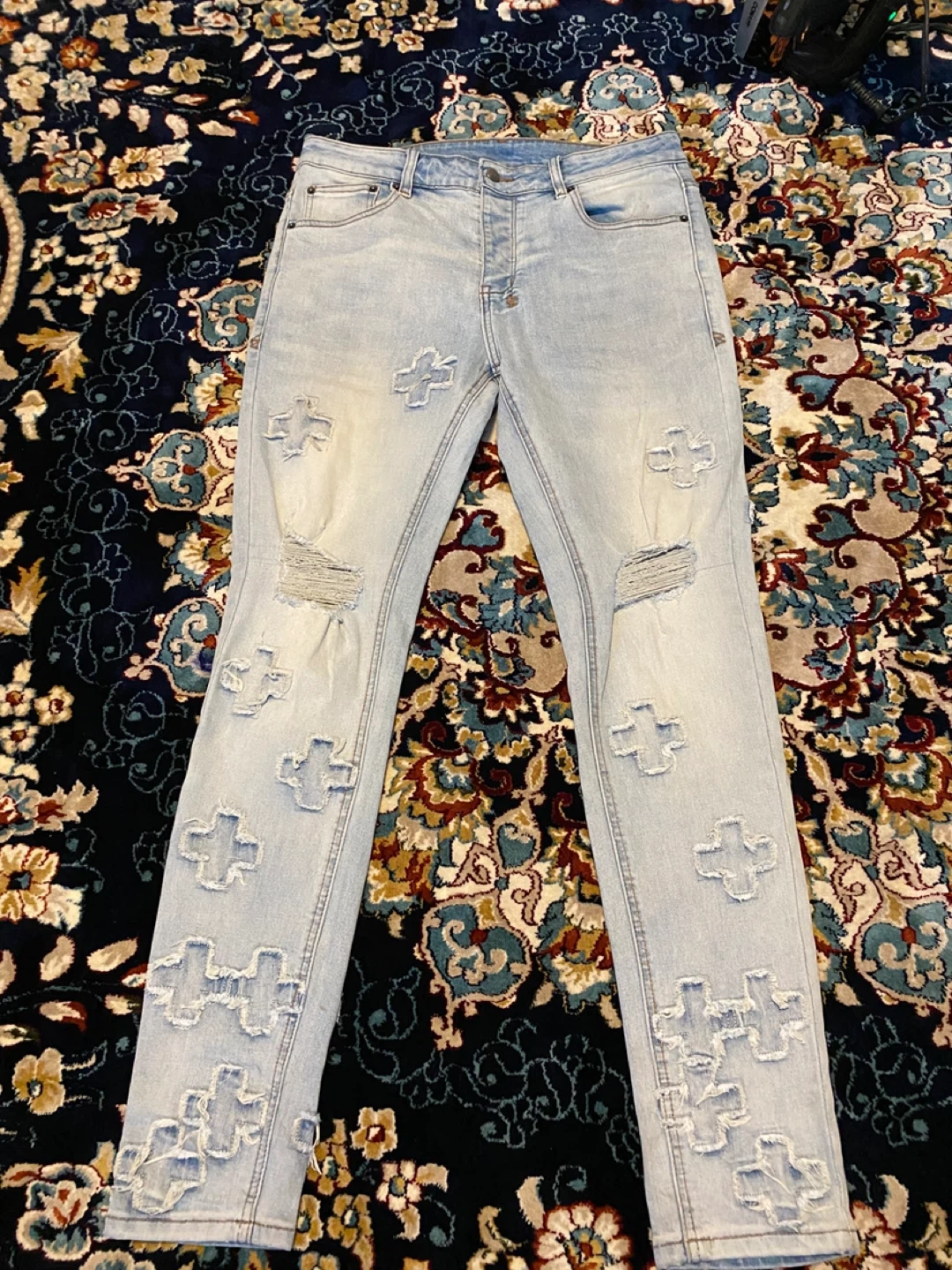 10Selling a pair of Ksubi jeans featuring the 'Royalty Heroism and the Streets' design. They're a light wash denim with distressed details and cross appliques. Great for adding an edgy touch to your wardrobe!