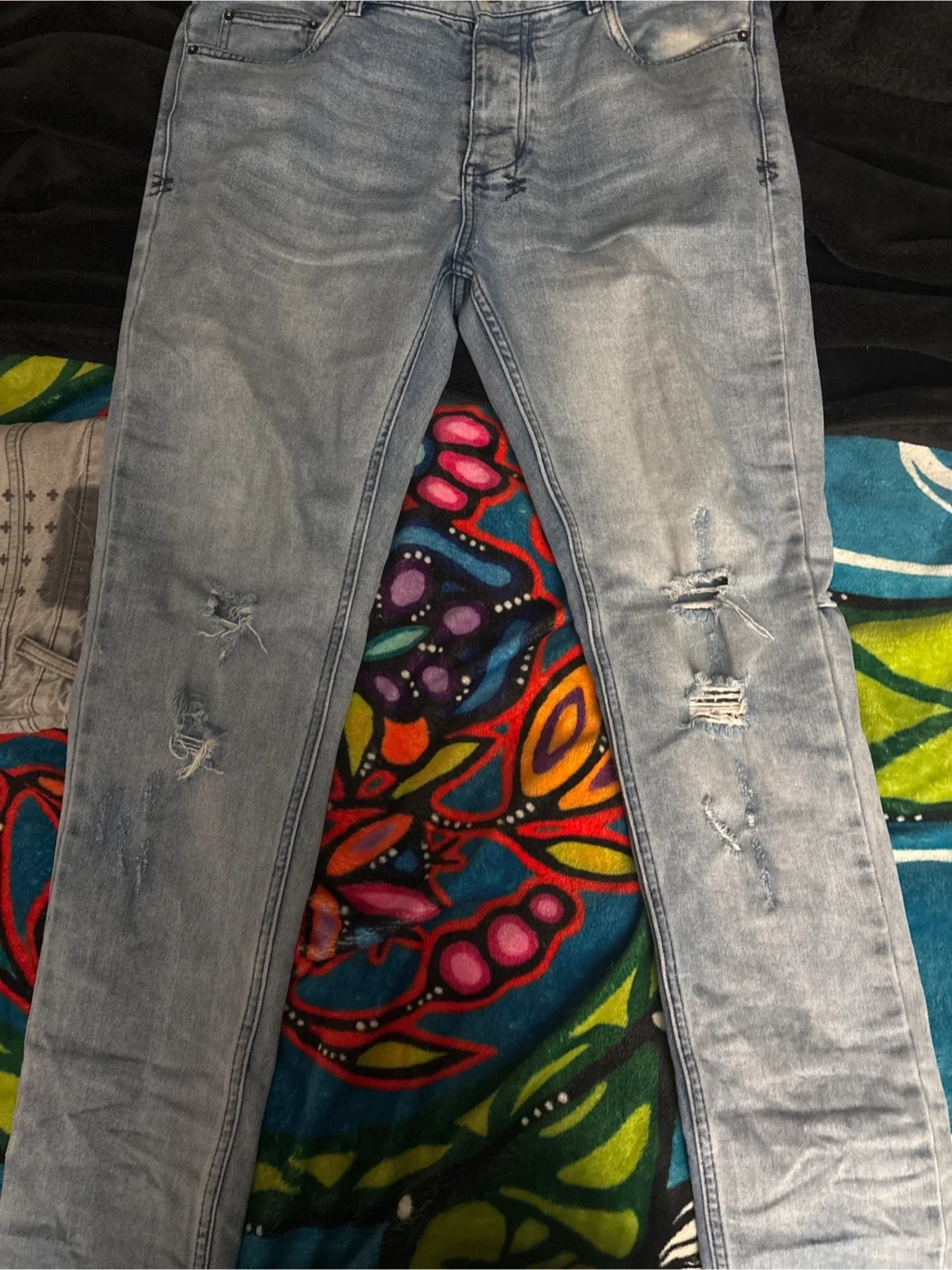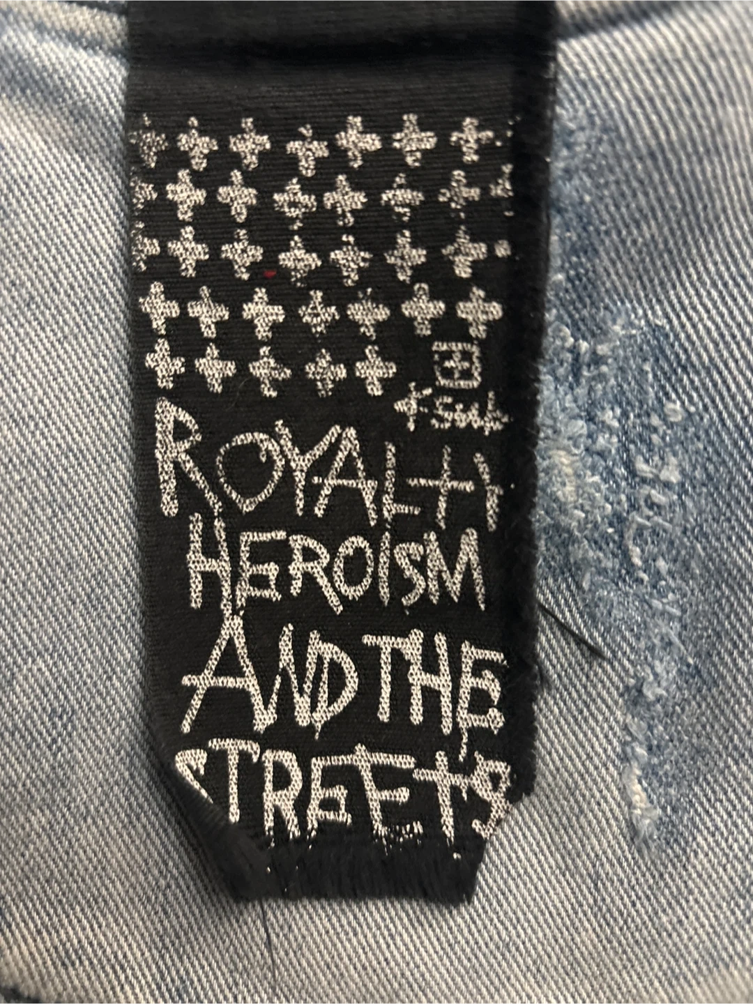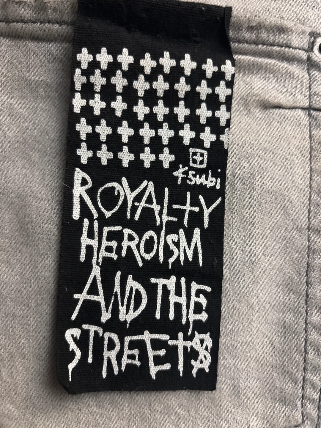 Selling a pair of Ksubi jeans with the 'Royalty Heroism and the Streets' design on the back pocket. They have a light wash and some distressed details. Great for a casual, edgy look!